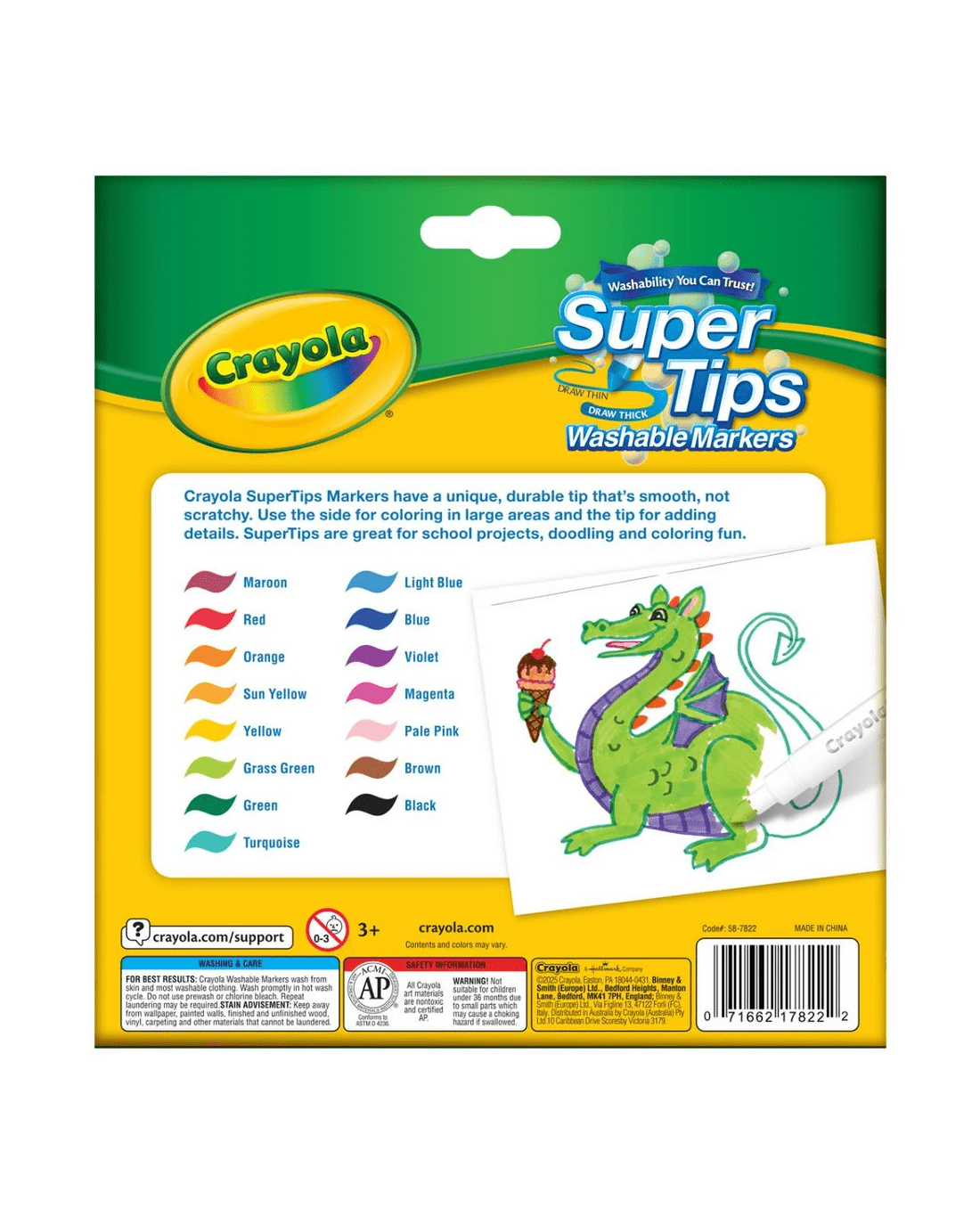 These Crayola Washable Supertip Markers are specially formulated to have bright and vivid colours, making them perfect for your next art project. The Markers feature a versatile tip that allows you to draw thick or thin lines and can be rejuvenated by dipping in room temperature water. The washable ink comes off machine washable clothing, walls, carpet and furniture with ease.