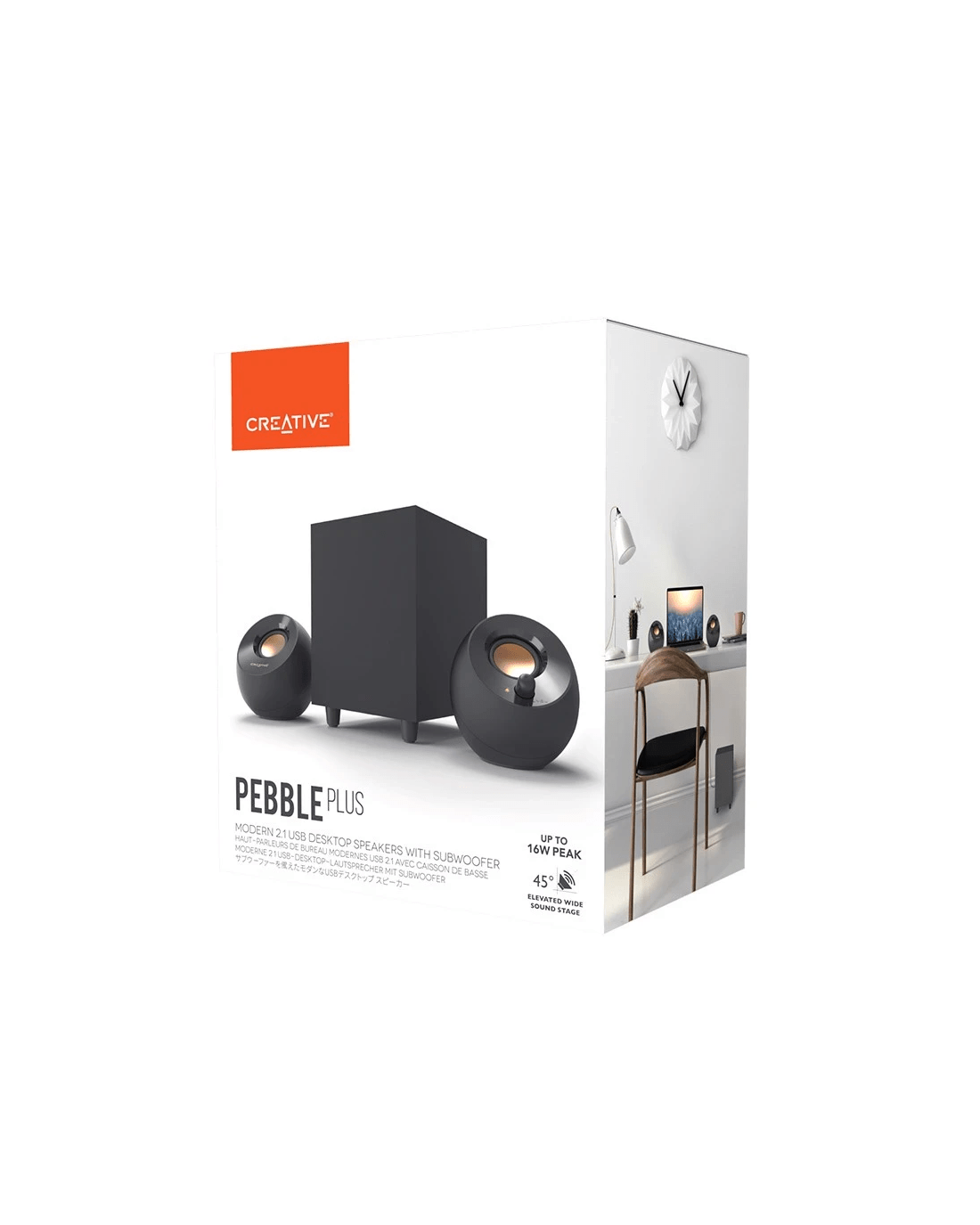 Further exemplifying the personification of Zen in the Pebble series, the new and enhanced Creative Pebble Plus offers impressive audio performance without omitting the clean, minimalist look that fits into almost any desktop setup. Featuring dual mid-field drivers set at a 45o angle and a down-firing ported subwoofer, the Pebble delivers crystal clear audio with bass and an elevated sound stage.