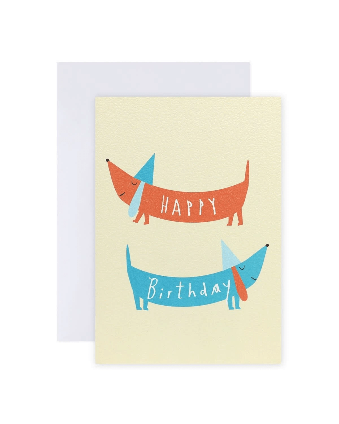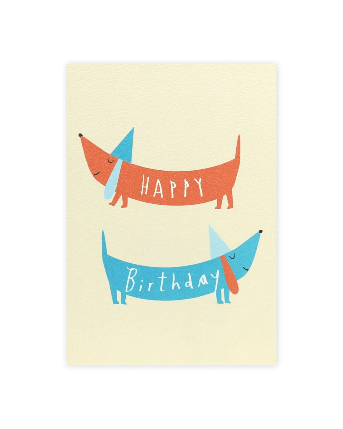 • The front of the card features textured paper, colourful illustrations of dachshund sausage dogs wearing party hats and the message 'HAPPY Birthday'