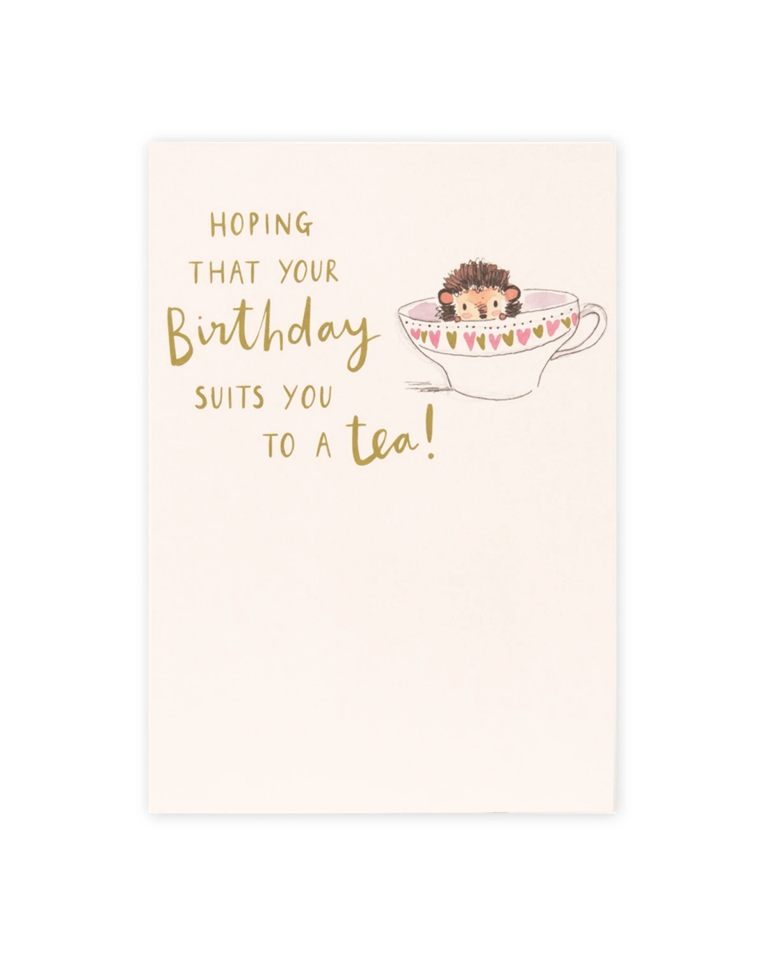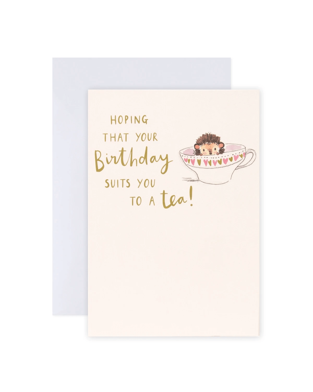 • The front of the card features an adorable illustration of a hedgehog sitting in a teacup alongside the message 'HOPING THAT YOUR Birthday SUITS YOU TO A tea!'
