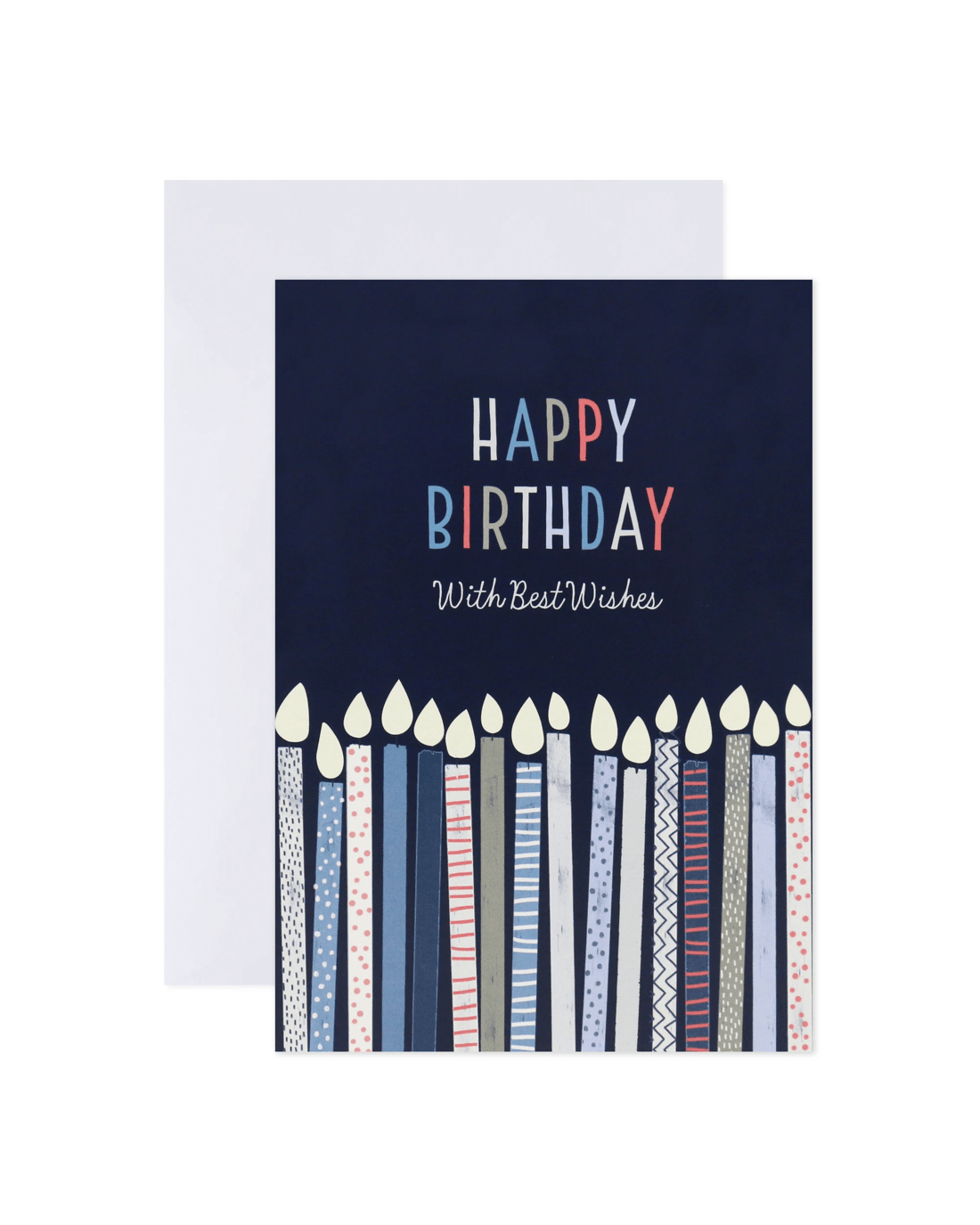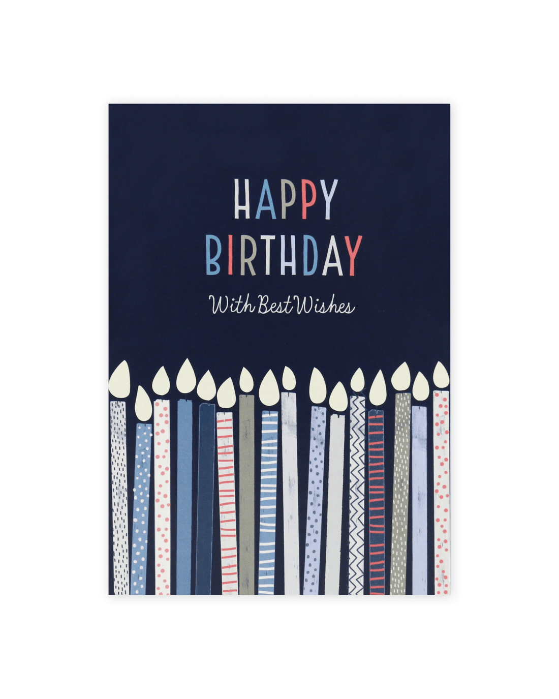 • The front of the card features illustrations of patterned birthday candles alongside the message 'HAPPY BIRTHDAY With Best Wishes'