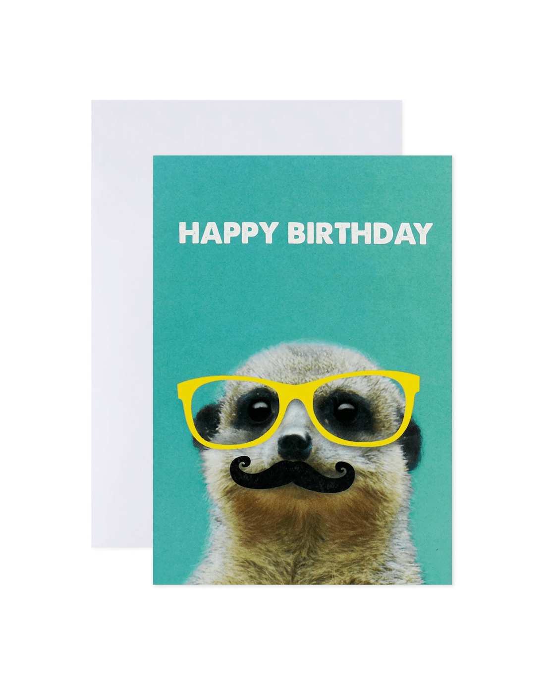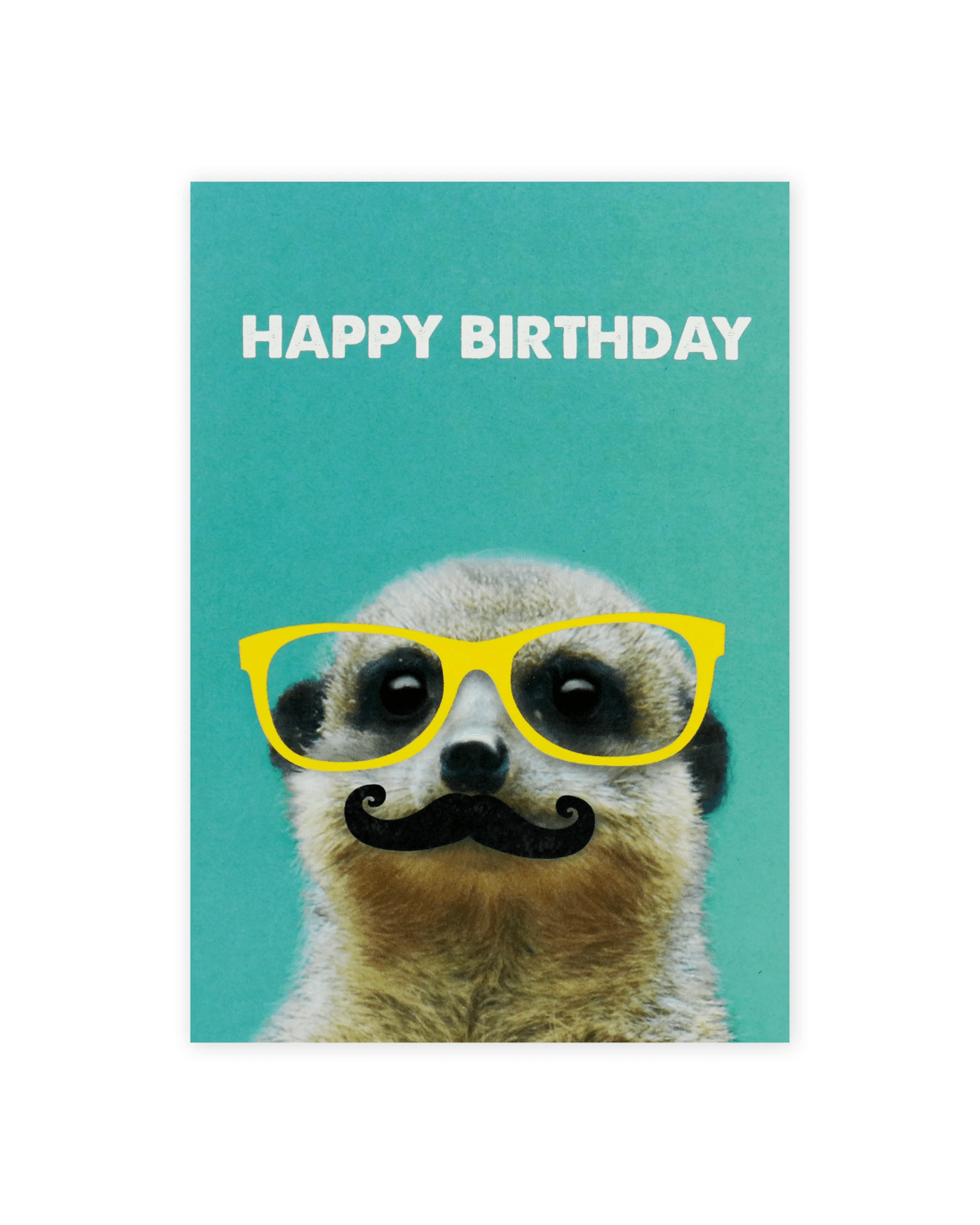 • The front of the card features a photograph of a meerkat wearing illustrated glasses and a moustache alongside the message 'HAPPY BIRTHDAY'