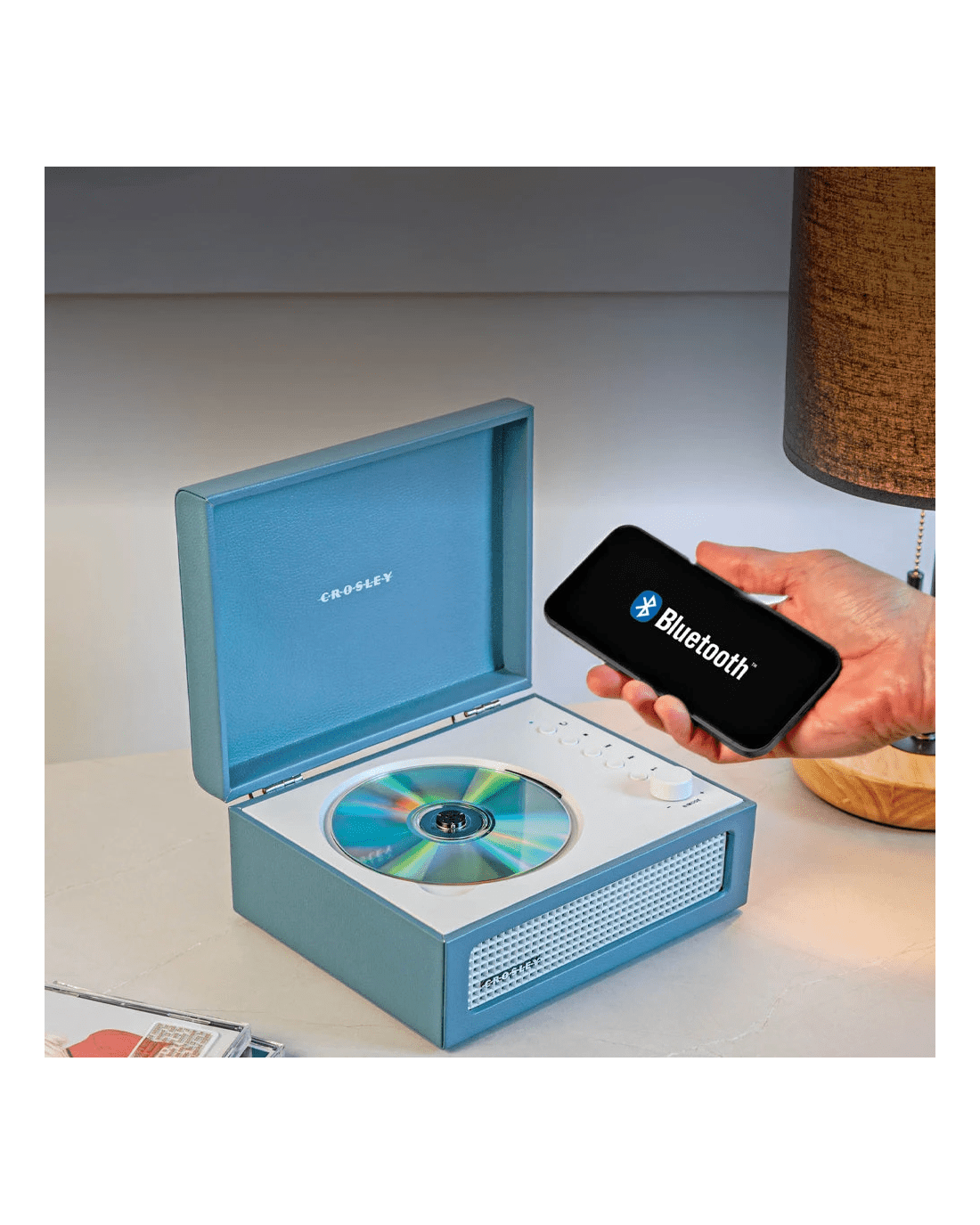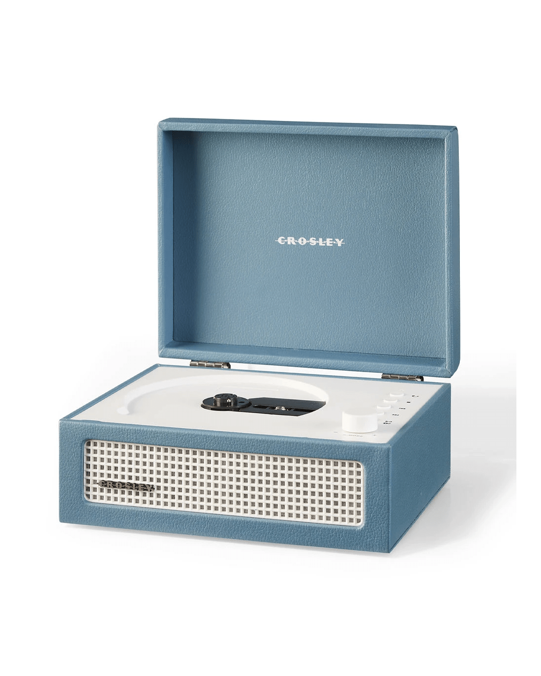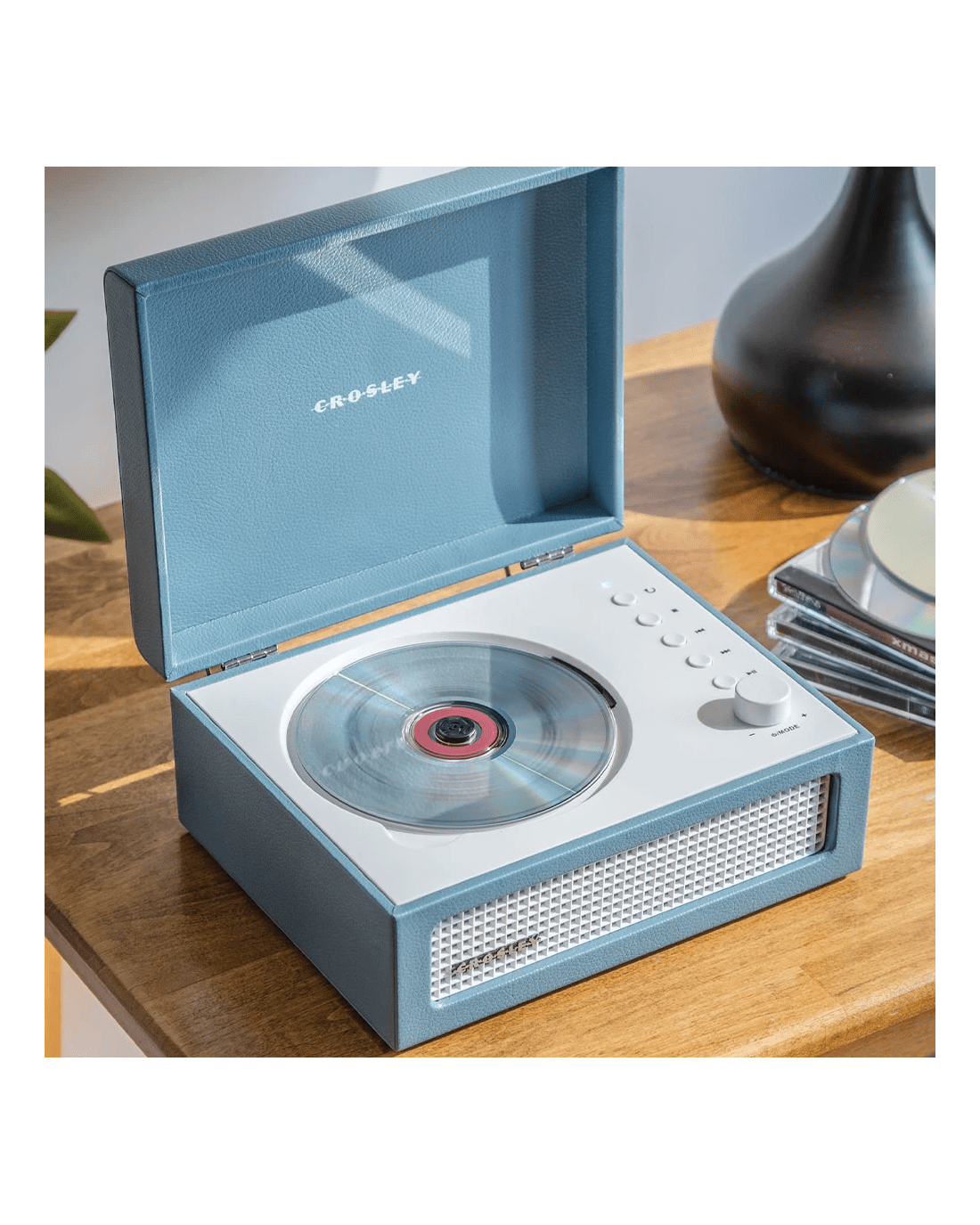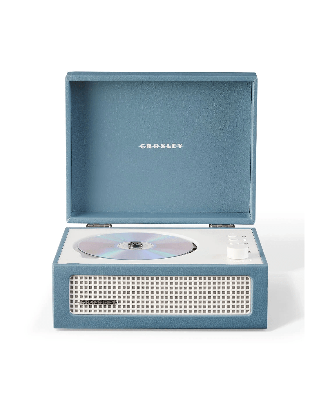 Crosley Voyager Portable Retro CD Player with Stereo Bluetooth Speakers, FM Radio - Washed Blue - It may look like a mini turntable, but the Voyager CD Player is designed for a different kind of spin — your favourite CDs. Combining retro charm with modern functionality, this compact player delivers style and sound wherever you go.