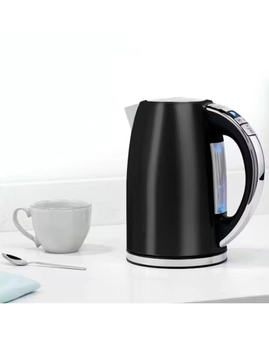 Elevate your kitchen with the Cuisinart 1.7L Multi-Temp Cordless Kettle in Black. Its sleek stainless steel housing with a matte black finish complements any decor. The illuminated water window and LCD display offer precise temperature control and easy readability. Boasting a powerful 2400-watt heating element and a generous 1.7-liter capacity, this kettle boils water quickly and efficiently. The 360-degree cordless base provides ease of use, while integrated cord storage and an easy-clean removable filter enhance its practicality.