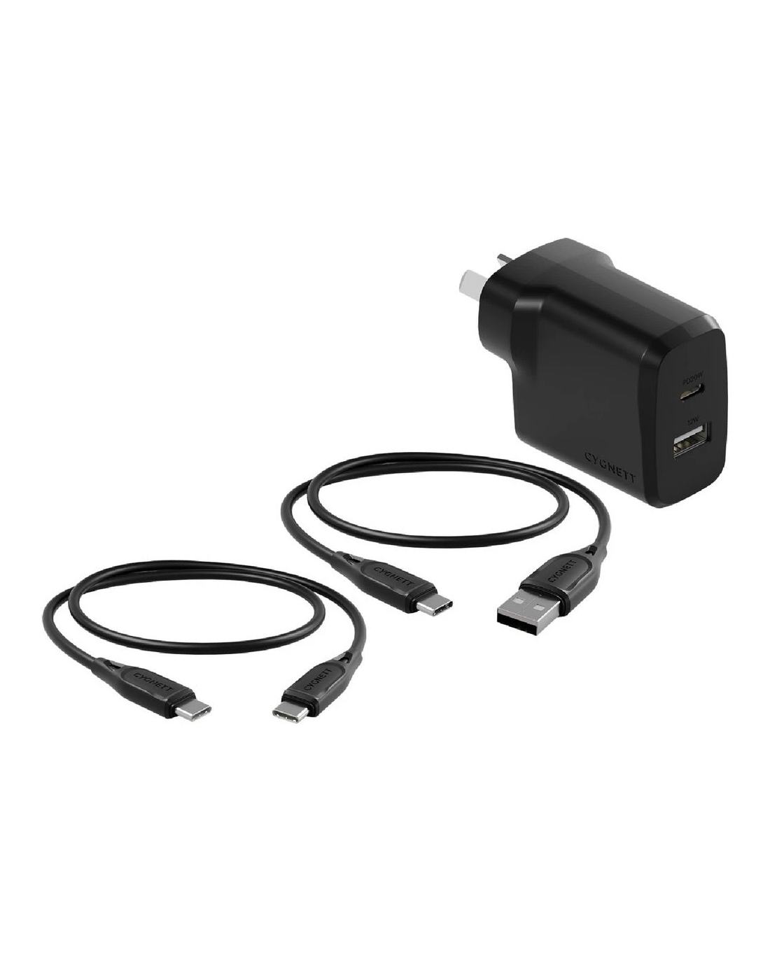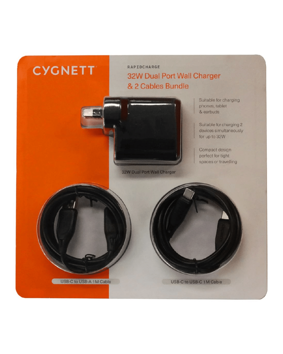 This Cygnett bundle comes with a 32 watt dual wall charger and two USB cables you can use to keep all your devices charged. It's suitable for a range of devices including phones, tablets and earbuds and includes both USB-A and USB-C connections for versatile use.