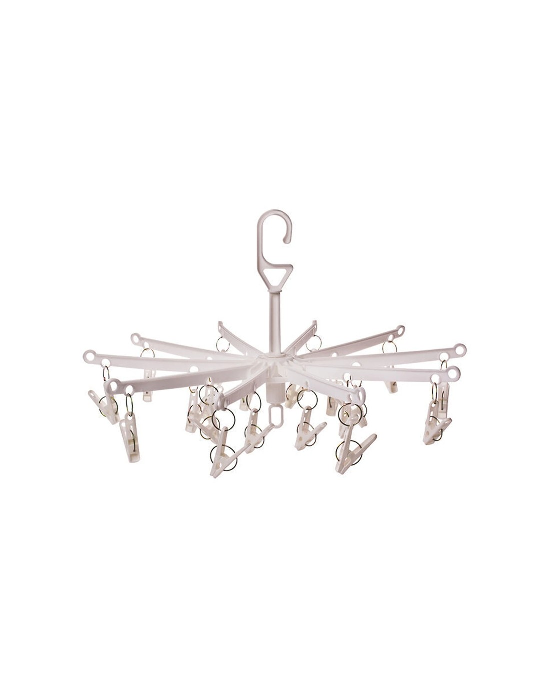 - Organised Hanging Space: Circular arrangement with arms and clips for drying small items and accessories.