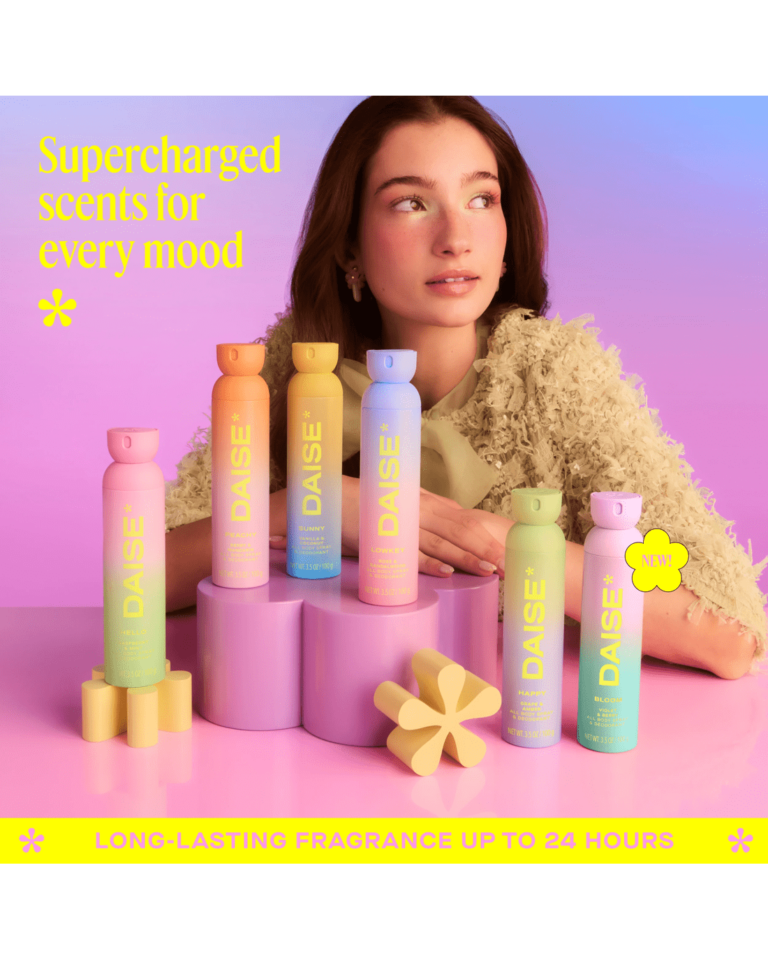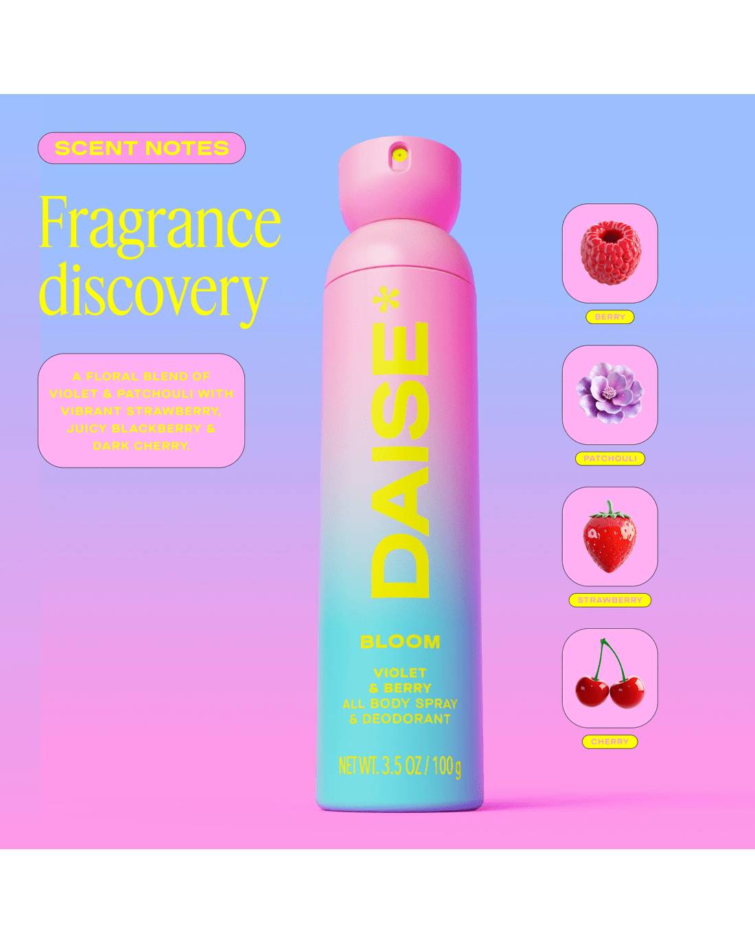 - DAISE Bloom All Body Spray & Deodorant: A violet & berry body mist with a soft, playful scent that lasts up to 24 hours