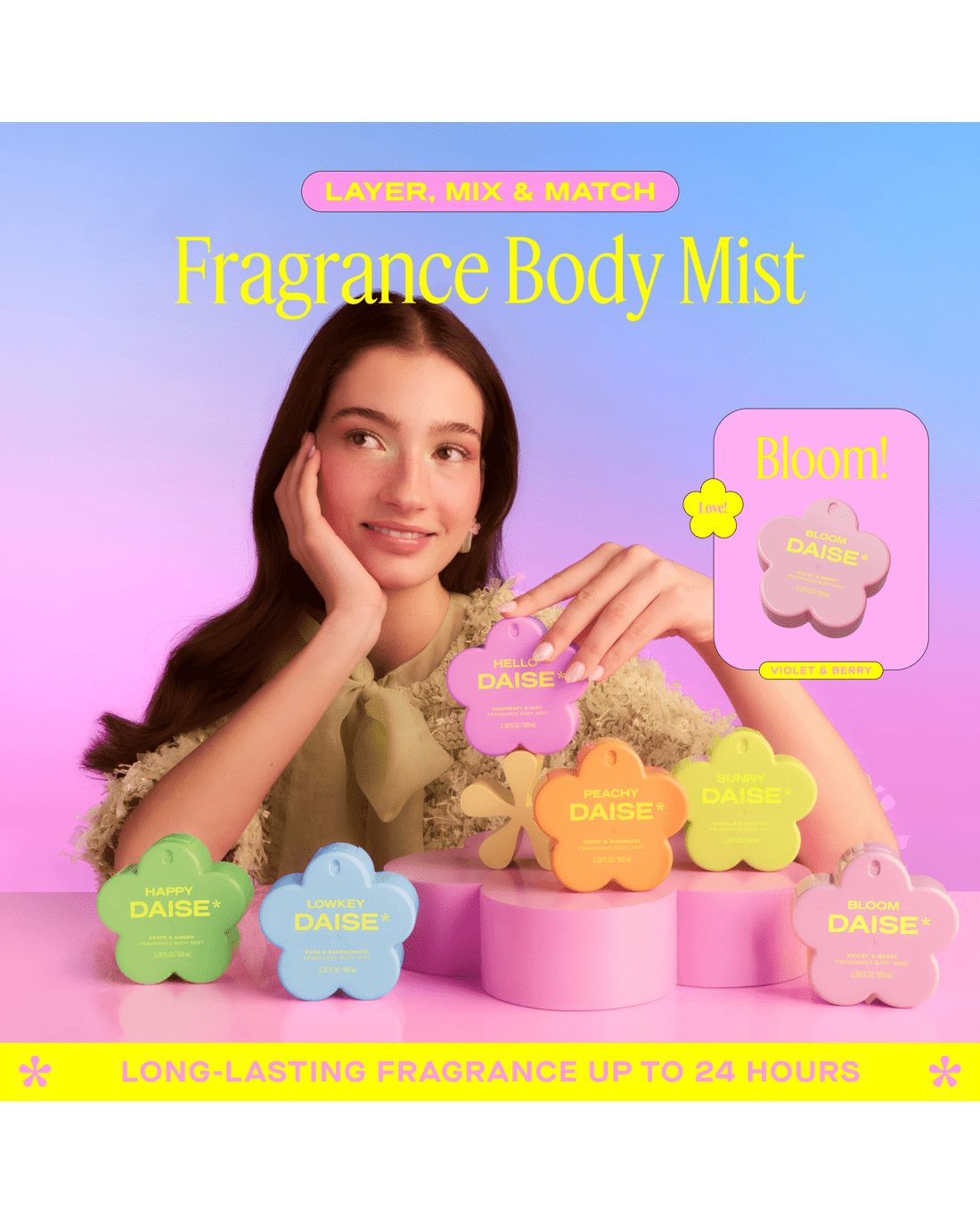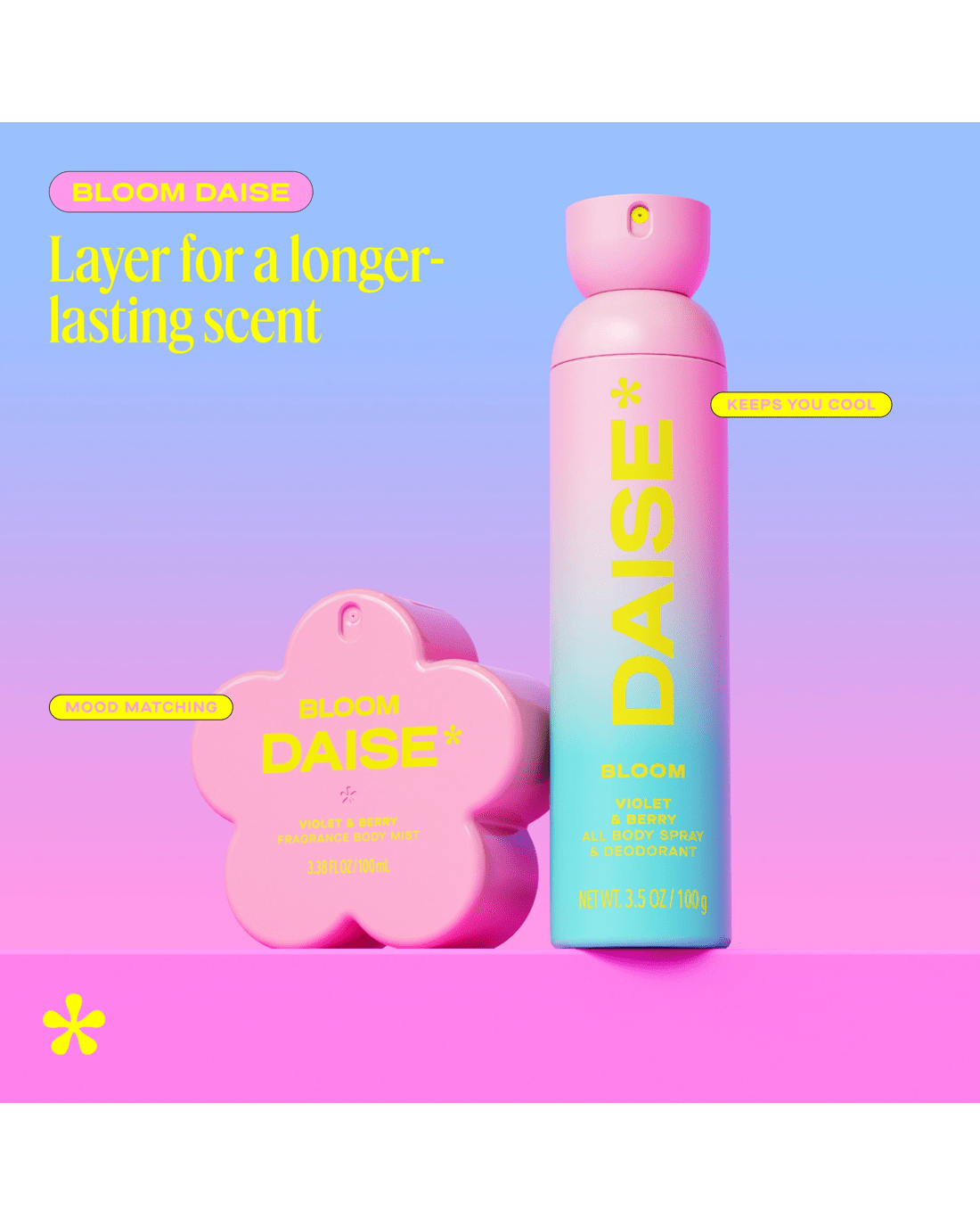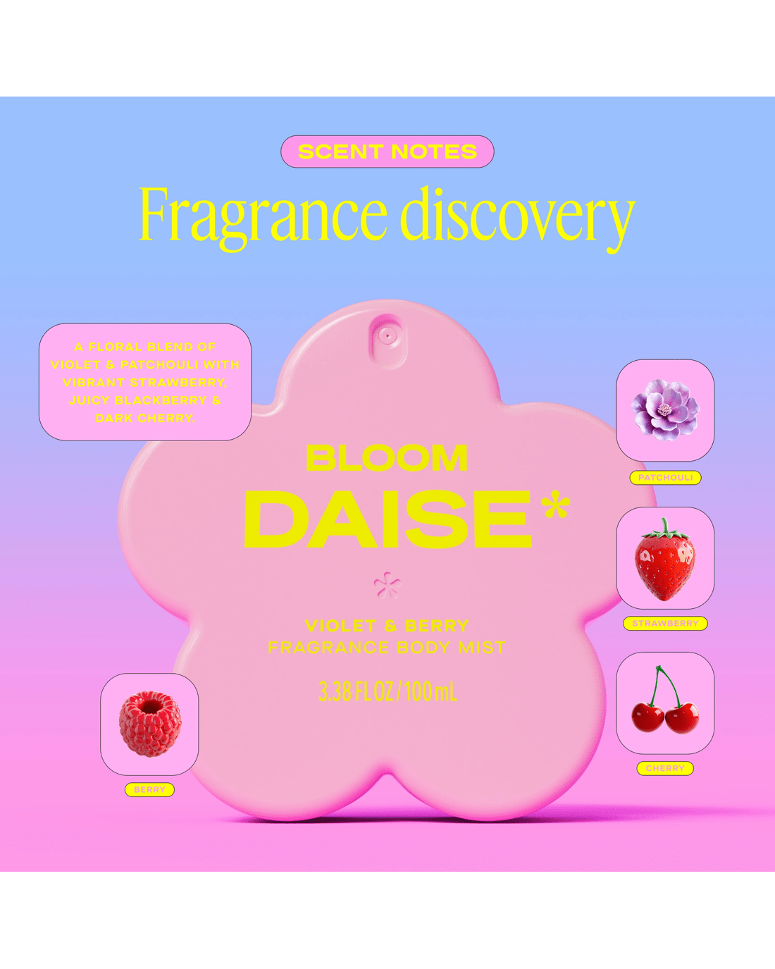 • DAISE bloom fragrance body mist: Violet & berry scented body mist with a playful, mood-lifting twist