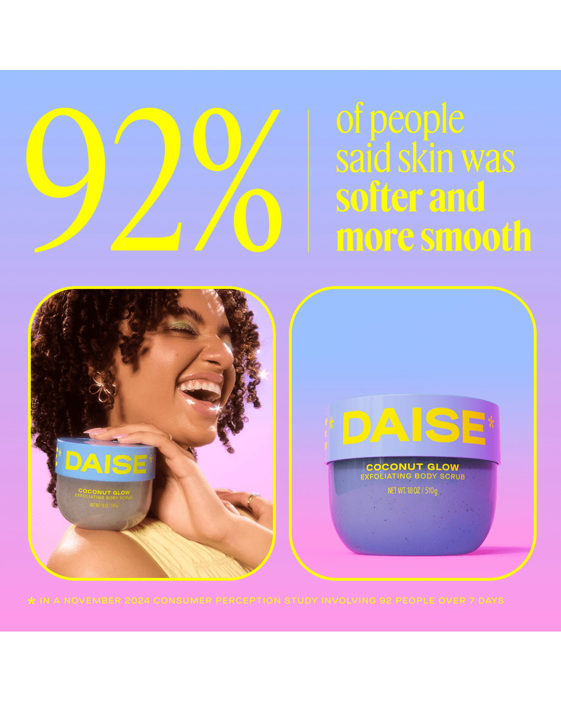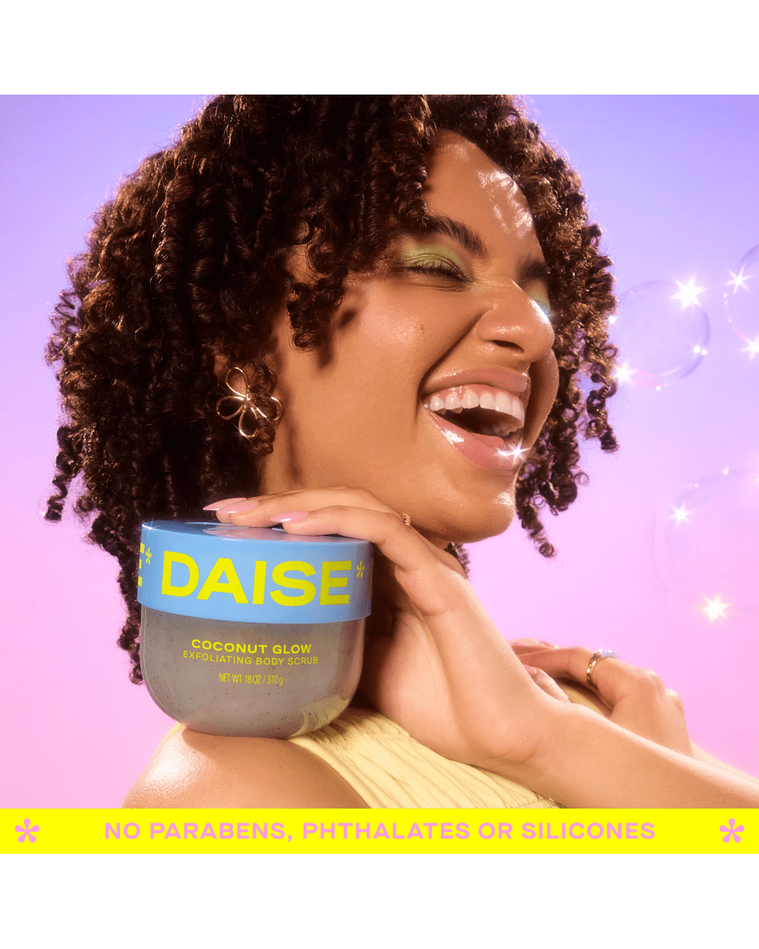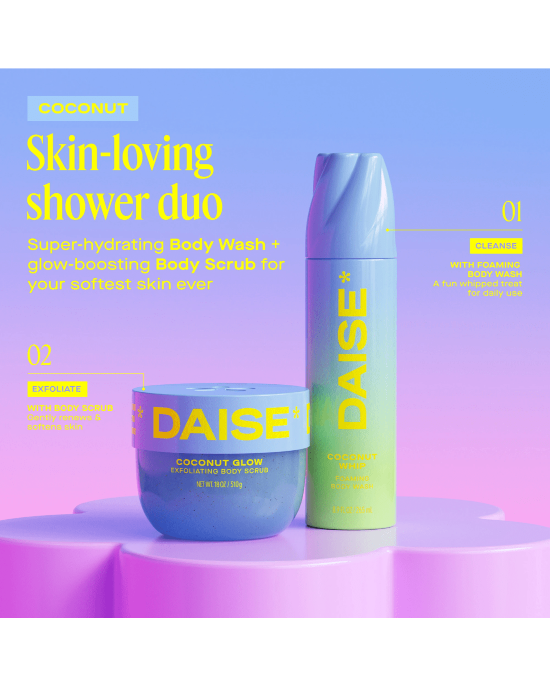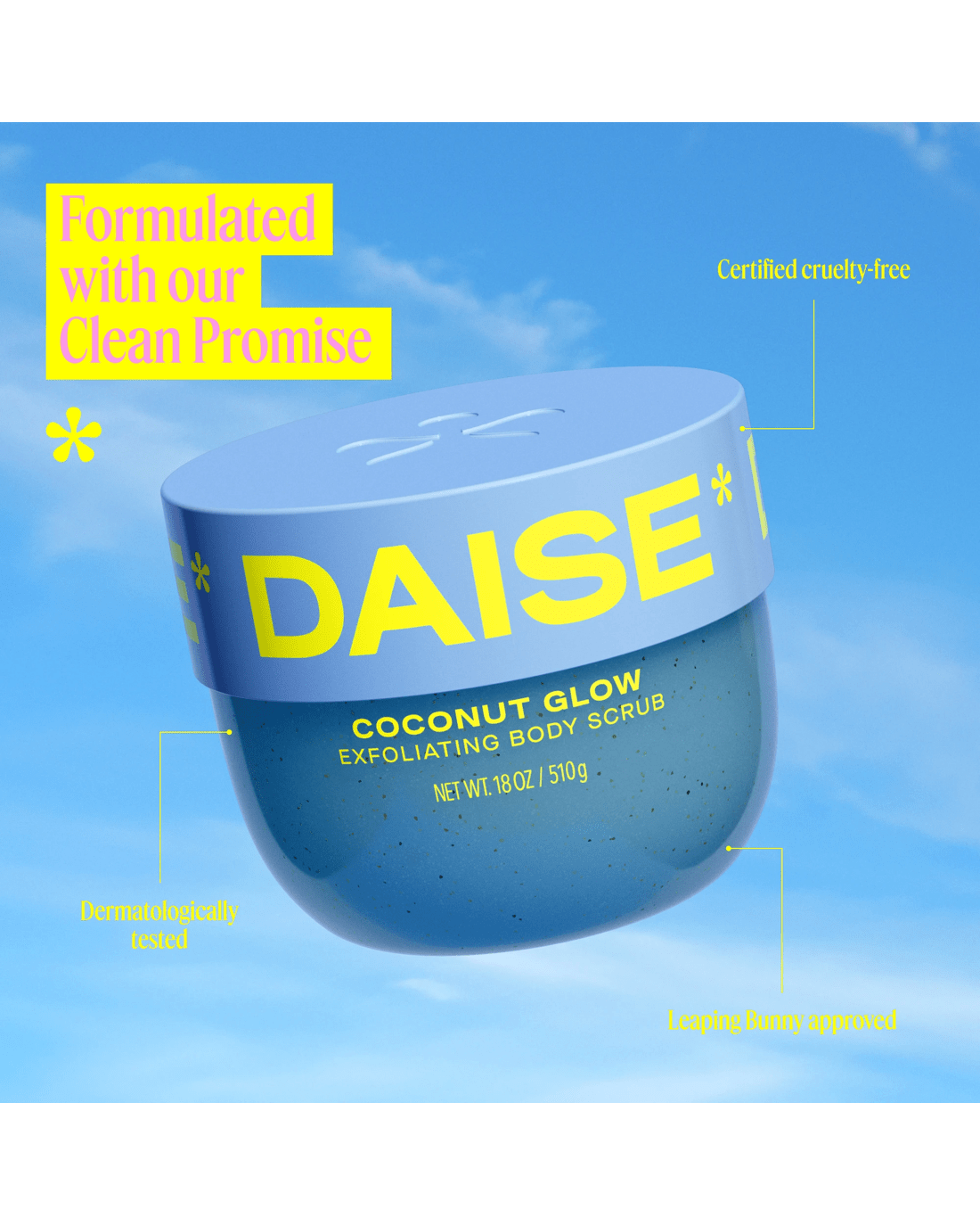 Treat yourself to glowing skin with DAISE Exfoliating Body Scrub in Coconut Glow. This exfoliating and renewing formula gently reveals soft and subtly scented skin, while the tropical coconut scent will bring joy to your shower or bath routine. Dermatologically tested and formulated with our clean promise, it's suitable for all skin types. Available in six fun and super collectible scents, there's Cherry Glow, Coconut Glow, Melon Glow, Pineapple Glow, Pomegranate Glow and Vanilla Glow. Pair with DAISE Foaming Body Wash and/or DAISE Bath Bombs for the ultimate bath or shower routine. Get ready to make your DAISE!