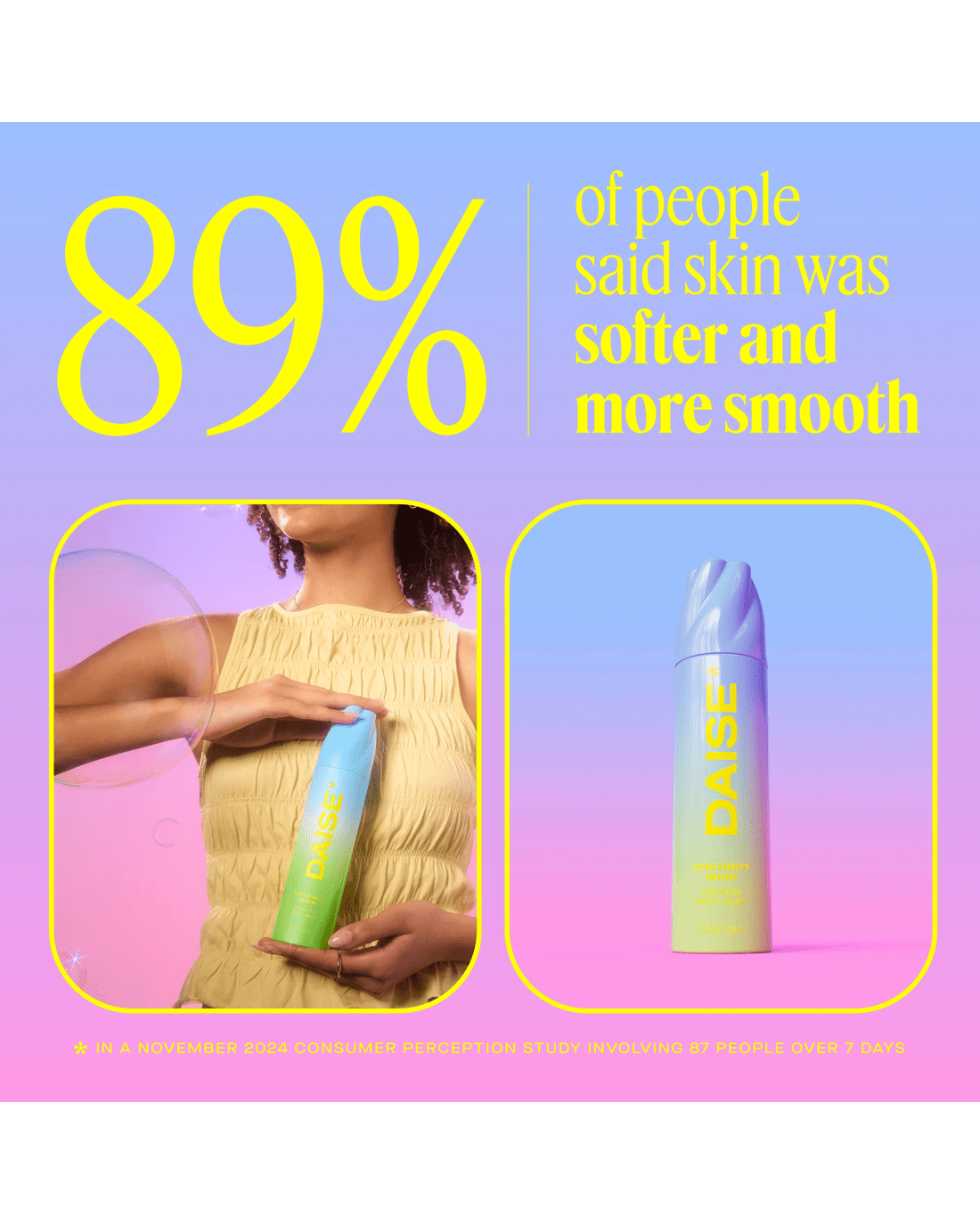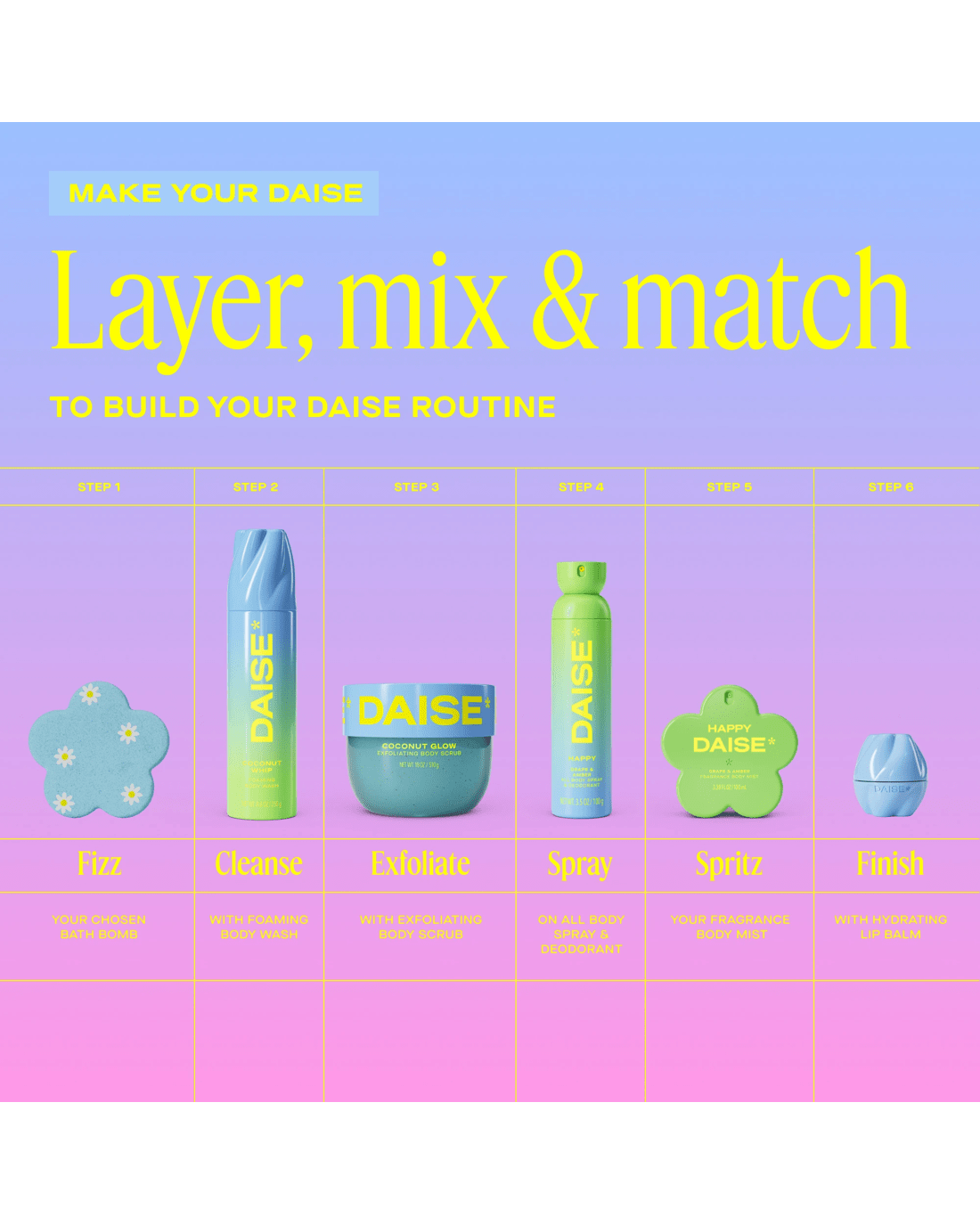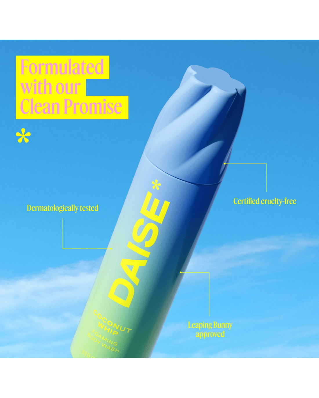 DAISE Foaming Body Wash in Coconut Whip is a super hydrating whipped formula that leaves skin feeling nourished, soft and subtly scented. Gentle enough for everyday use, it lathers to delicately clean and refresh skin, while the tropical coconut scent is guaranteed to bring joy to your day. Dermatologically tested and formulated with our clean promise, it’s suitable for all skin types. Available in six fun and super collectible scents, there’s Cherry Whip, Coconut Whip, Melon Whip, Pineapple Whip, Pomegranate Whip and Vanilla Whip. Pair with DAISE Exfoliating Body Scrub and/or DAISE Bath Bombs for the ultimate bath or shower routine. Whatever your mood, there’s a DAISE to match!