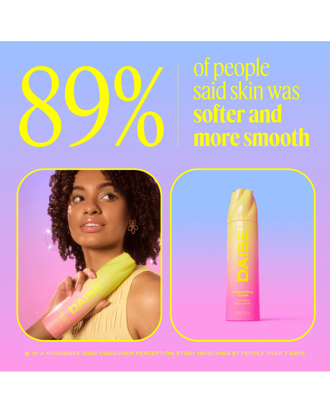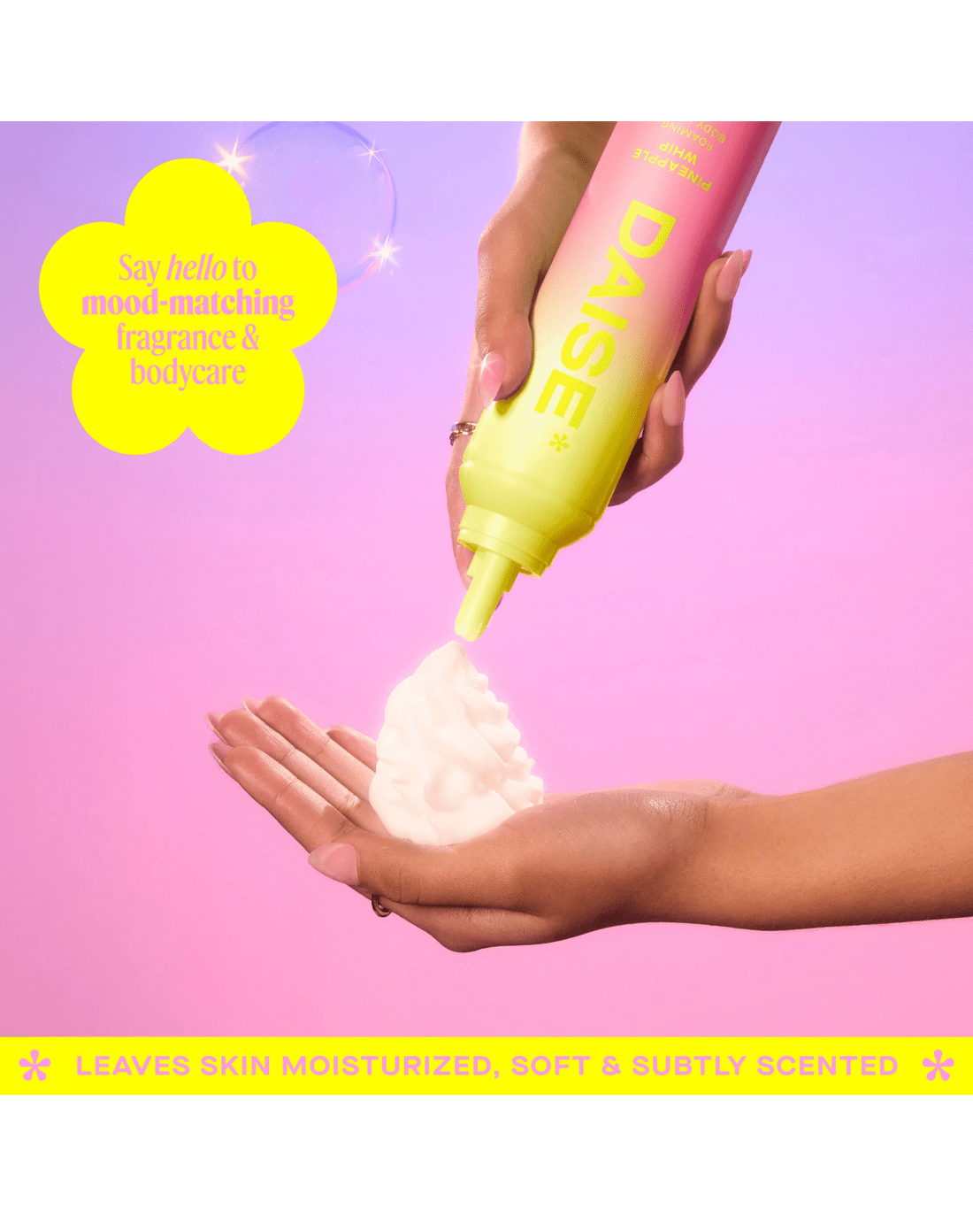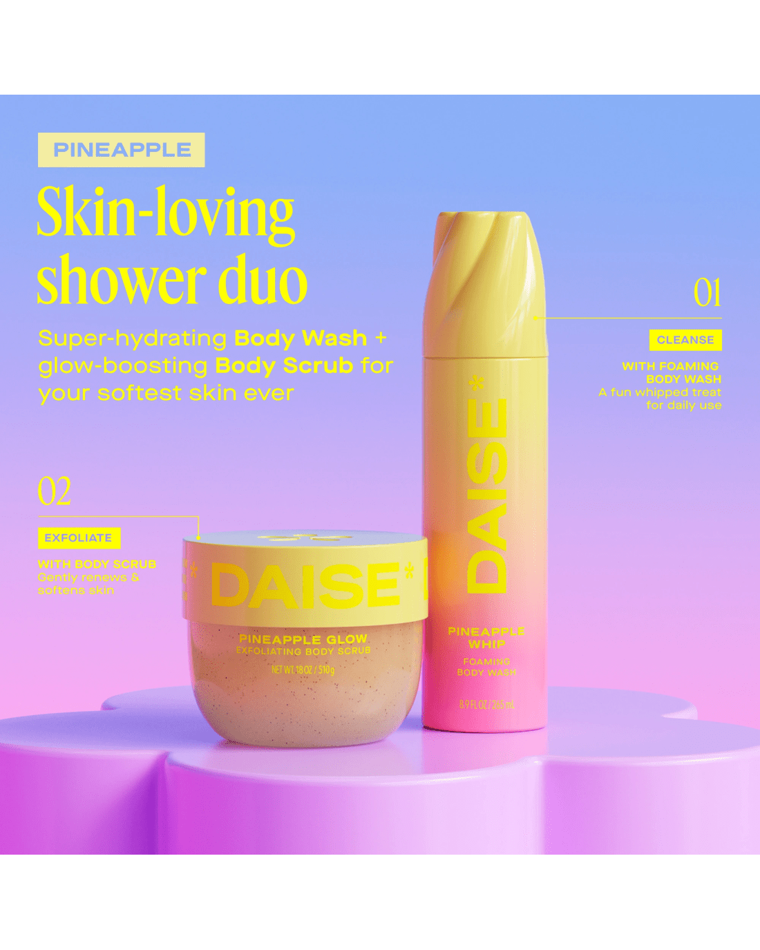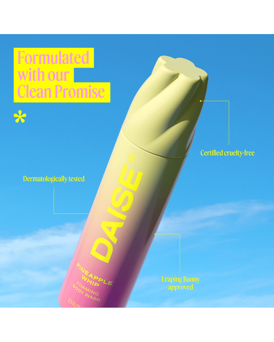 DAISE Foaming Body Wash in Pineapple Whip is a super-hydrating whipped formula that leaves skin feeling nourished, soft and subtly scented. Gentle enough for everyday use, it lathers to delicately clean and refresh skin, while the tropical pineapple scent is guaranteed to bring joy to your day. Dermatologically tested and formulated with our clean promise, it's suitable for all skin types. Available in six fun and super collectible scents, there's Cherry Whip, Coconut Whip, Melon Whip, Pineapple Whip, Pomegranate Whip and Vanilla Whip. Pair with DAISE Exfoliating Body Scrub and/or DAISE Bath Bombs for the ultimate bath or shower routine. Whatever your mood, there's a DAISE to match!