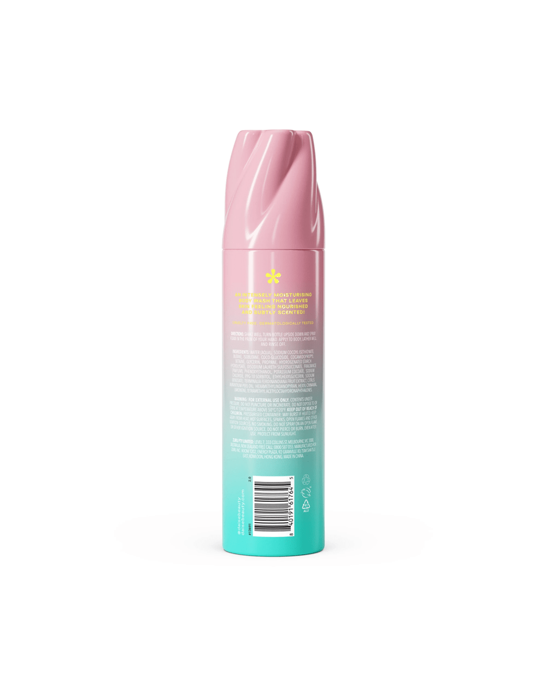 - Ingredients: Water (Aqua), Sodium Cocoyl Isethionate, Butane, Isobutane, Coco-Glucoside, Cocamidopropyl Betaine, Glycerin, Propane, Hydrogenated Starch Hydrolysate, Disodium Laureth Sulfosuccinate, Fragrance (Parfum), Phenoxyethanol, Potassium Cocoate, Sodium Chloride, Ppg-10 Sorbitol, Ethylhexyglycerin, Sodium Benzoate, Terminalia Ferdinandiana Fruit Extract, Citrus Aurantium Peel Oil, Hexamethylindanopyran, Hexyl Cinnamal, Limonene, Tetramethylacetyloctahydronaphthalenes