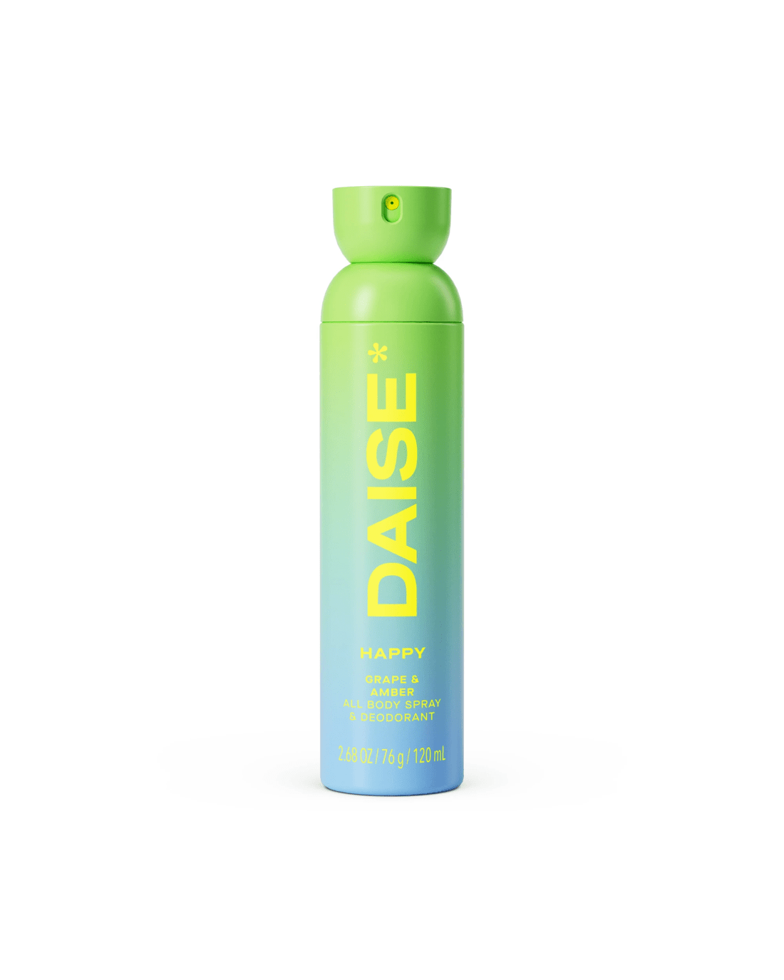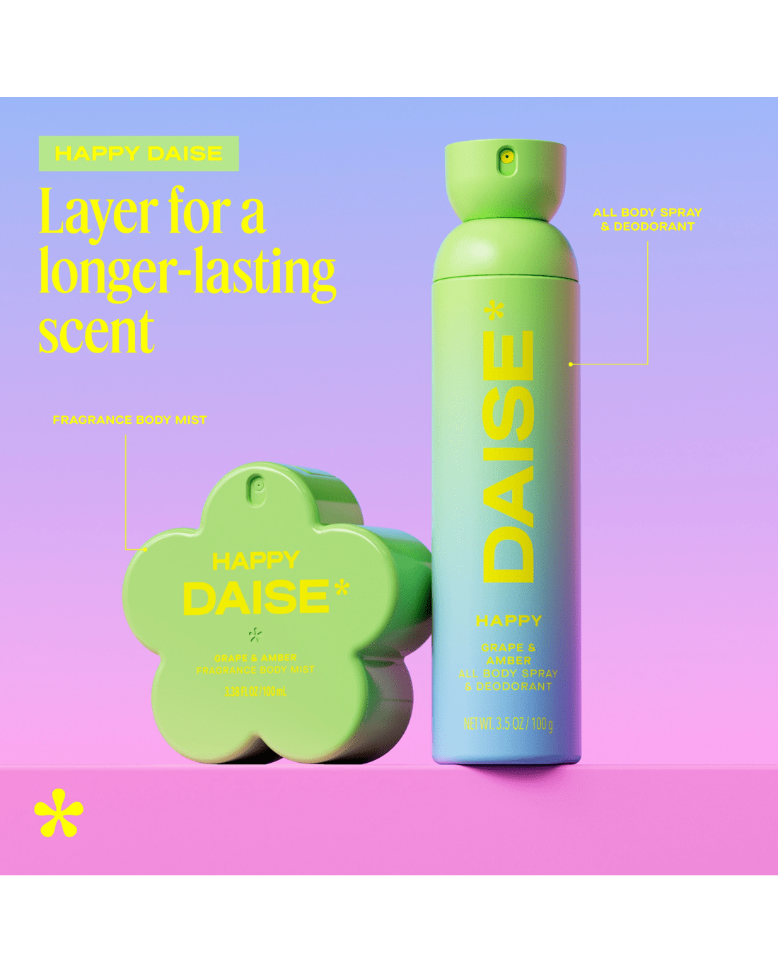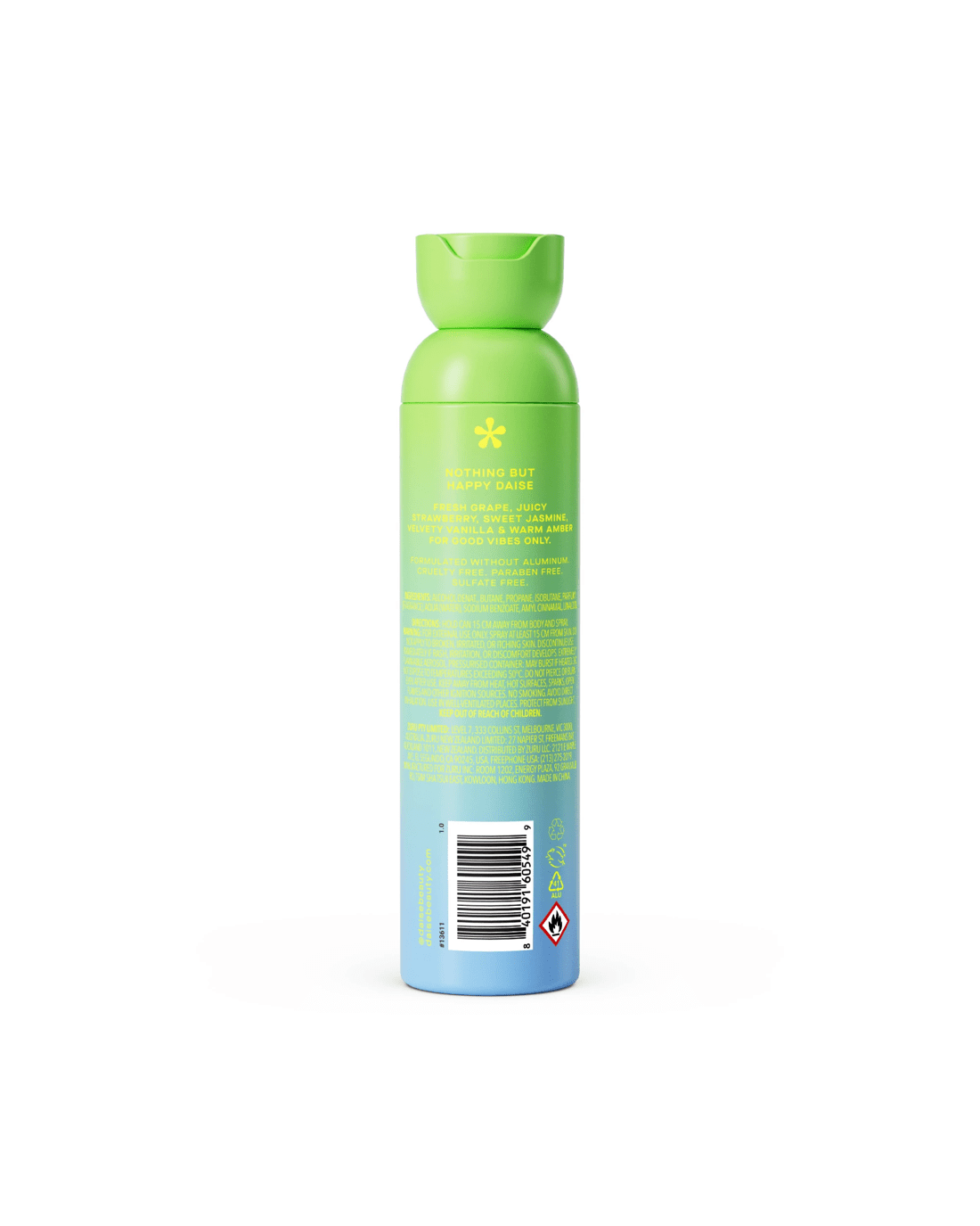Meet your new all-rounder body spray! DAISE Happy Daise All Body Spray & Deodorant is designed to keep you feeling confident, cool and cute with a fresh grape and amber scent that can go everywhere. Happy Daise is a good-vibe blend of fruity grape, fresh strawberry, sweet jasmine, velvety vanilla and warm amber-and lasts for up to 24 hours. Dermatologically tested and formulated with our clean promise, this aluminium-free formula is suitable for whole body use every day. Available in six versatile floral- and fruit-forward fragrances, there's Happy Daise (Grape & Amber), Hello Daise (Raspberry & Mint), Lowkey Daise (Rose & Sandalwood), Oh So Daise (Pear & Patchouli), Peachy Daise (Berry & Mandarin) and Sunny Daise (Vanilla & Coconut). Spray based on your mood, layer them to craft your signature scent, or mix-and-match to create a totally new DAISE.