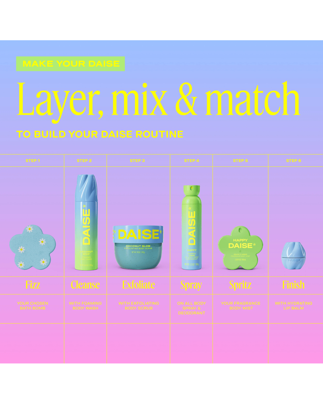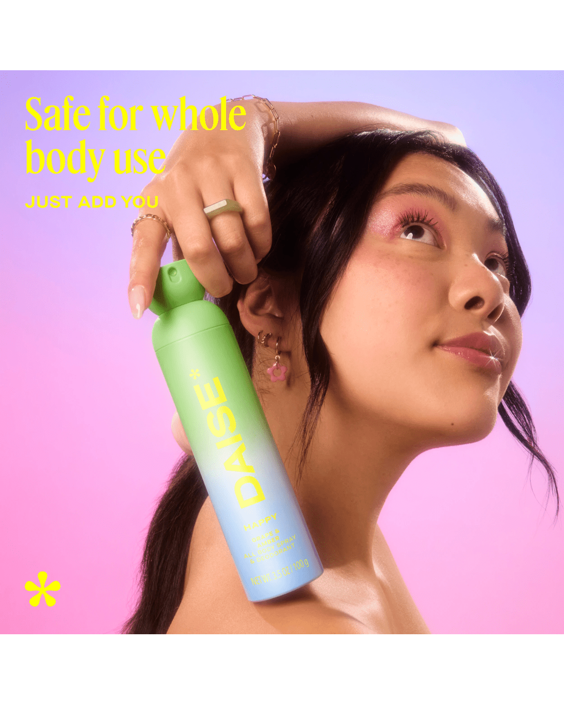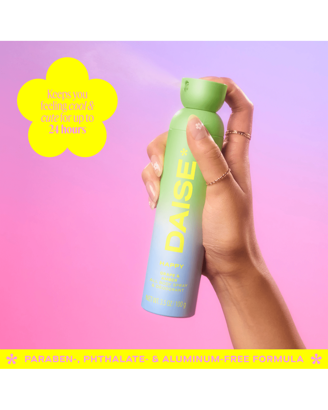 Meet your new all-rounder body spray! DAISE Happy Daise All Body Spray & Deodorant is designed to keep you feeling confident, cool and cute with a fresh grape and amber scent that can go everywhere. Happy Daise is a good-vibe blend of fruity grape, fresh strawberry, sweet jasmine, velvety vanilla and warm amber-and lasts for up to 24 hours. Dermatologically tested and formulated with our clean promise, this aluminium-free formula is suitable for whole body use every day. Available in six versatile floral- and fruit-forward fragrances, there's Happy Daise (Grape & Amber), Hello Daise (Raspberry & Mint), Lowkey Daise (Rose & Sandalwood), Oh So Daise (Pear & Patchouli), Peachy Daise (Berry & Mandarin) and Sunny Daise (Vanilla & Coconut). Spray based on your mood, layer them to craft your signature scent, or mix-and-match to create a totally new DAISE.