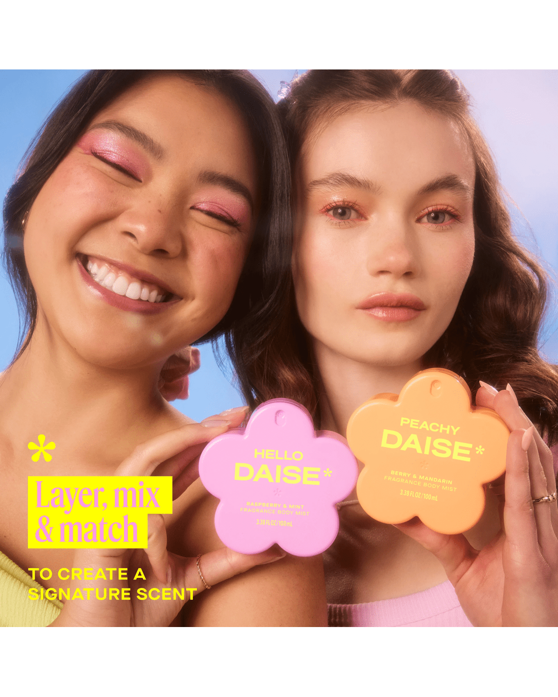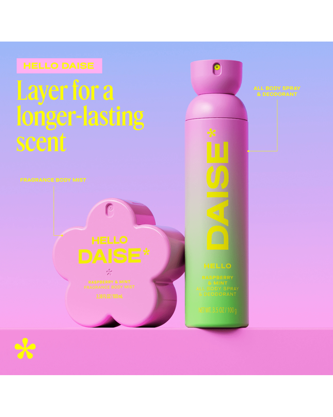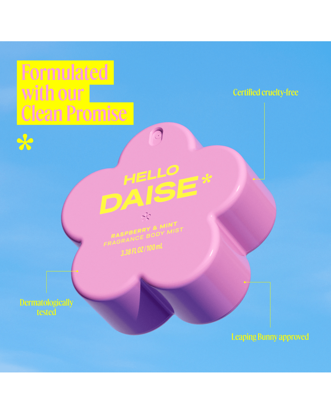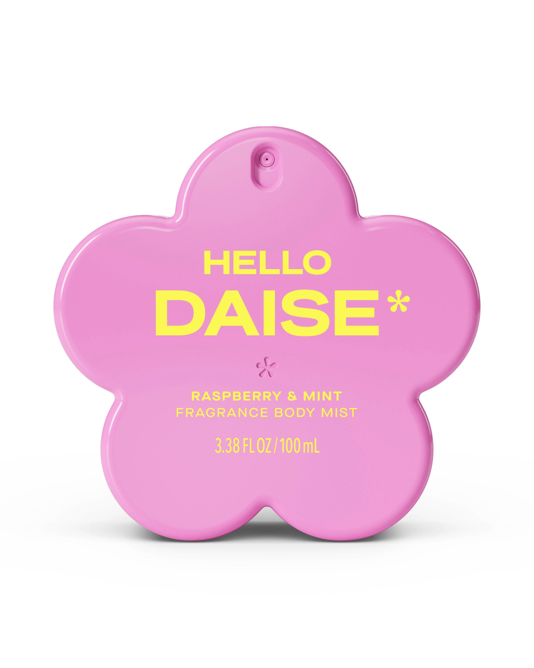 Meet your new go-to body and hair spritz! DAISE Hello Daise Fragrance Body Mist is a fresh, mood-matching raspberry and mint scent that's perfect for body and hair. Hello Daise is bursting with tangy raspberry, blackcurrant, zesty mint, whipped coconut and vanilla and lingers for up to twenty four hours. Available in six cute and collectible floral and fruit-forward fragrances, there's Happy Daise (Grape and Amber), Hello Daise (Raspberry and Mint), Lowkey Daise (Rose and Sandalwood), Oh So Daise (Pear and Patchouli), Peachy Daise (Berry and Mandarin) and Sunny Daise (Vanilla and Coconut). Spritz based on your mood, layer them to craft your signature scent or mix-and-match to create a totally new DAISE.