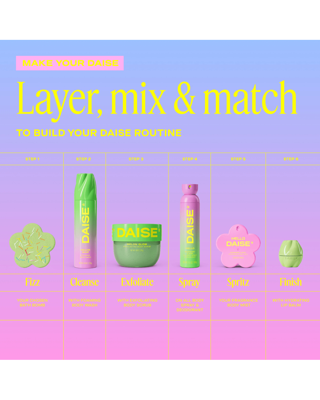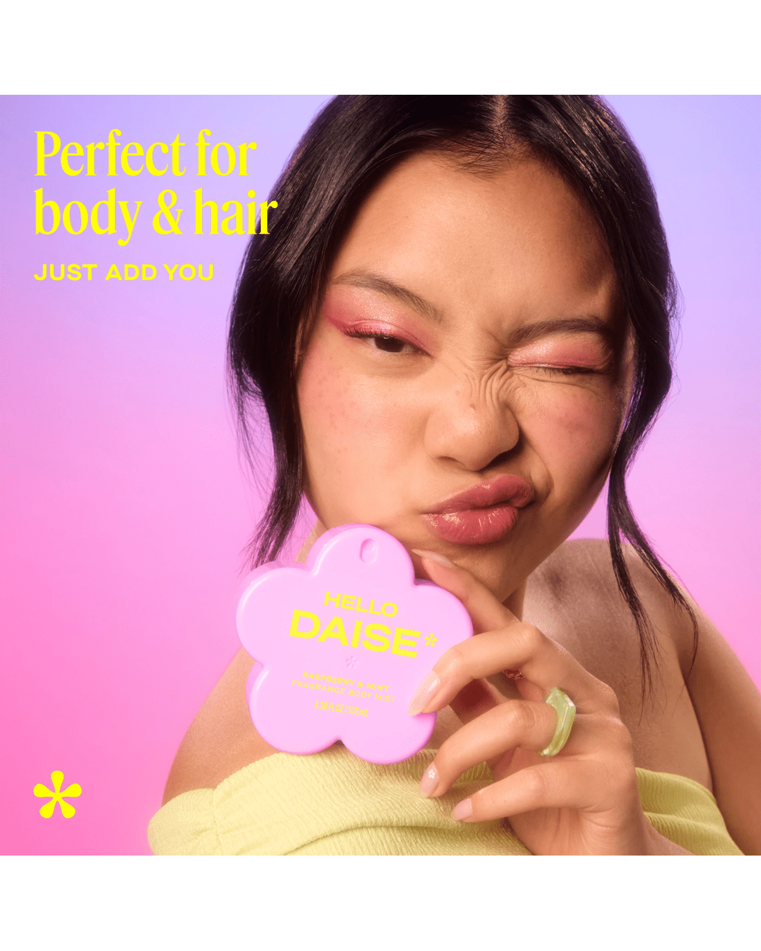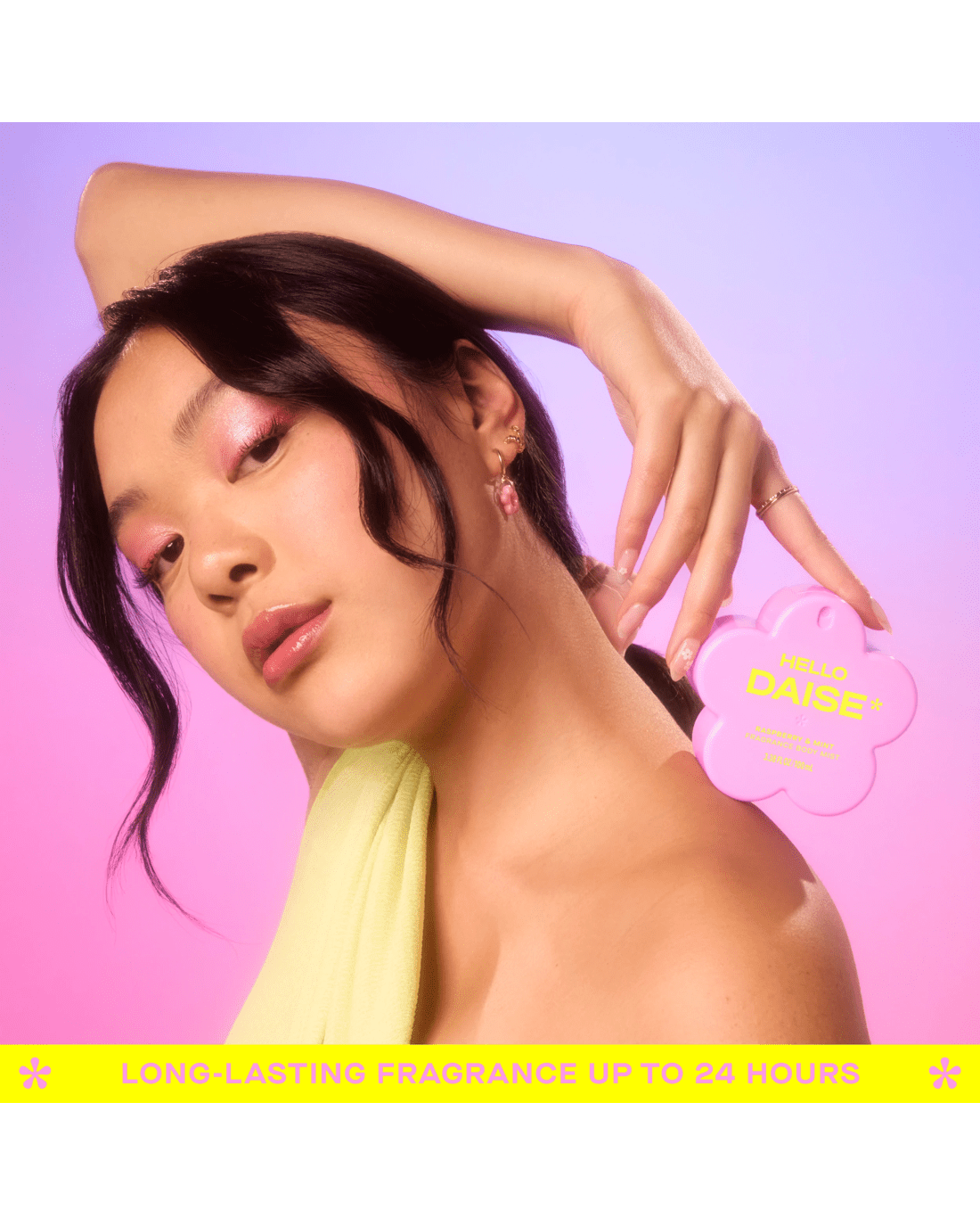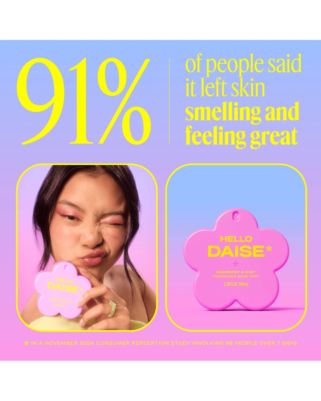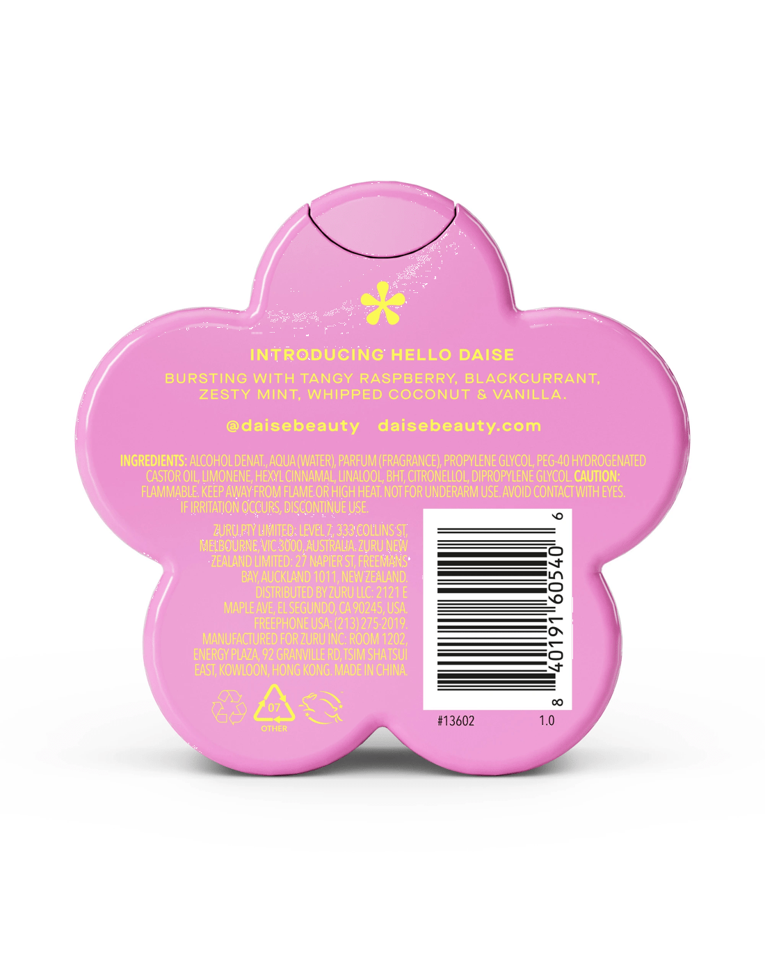 Meet your new go-to body and hair spritz! DAISE Hello Daise Fragrance Body Mist is a fresh, mood-matching raspberry and mint scent that's perfect for body and hair. Hello Daise is bursting with tangy raspberry, blackcurrant, zesty mint, whipped coconut and vanilla and lingers for up to twenty four hours. Available in six cute and collectible floral and fruit-forward fragrances, there's Happy Daise (Grape and Amber), Hello Daise (Raspberry and Mint), Lowkey Daise (Rose and Sandalwood), Oh So Daise (Pear and Patchouli), Peachy Daise (Berry and Mandarin) and Sunny Daise (Vanilla and Coconut). Spritz based on your mood, layer them to craft your signature scent or mix-and-match to create a totally new DAISE.