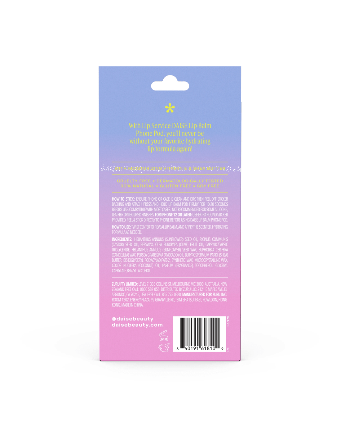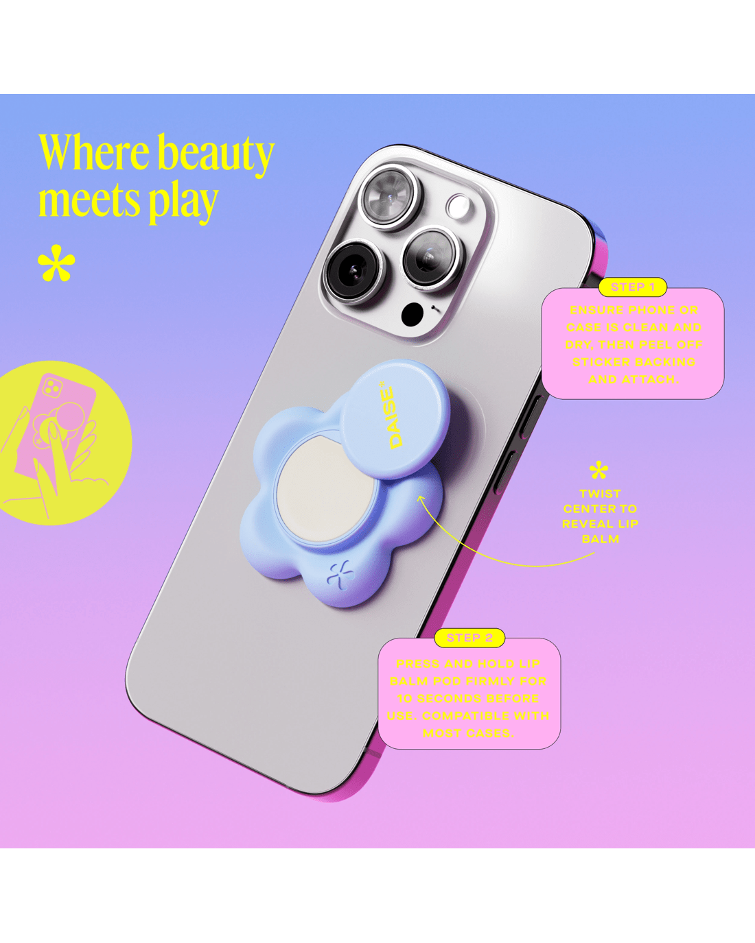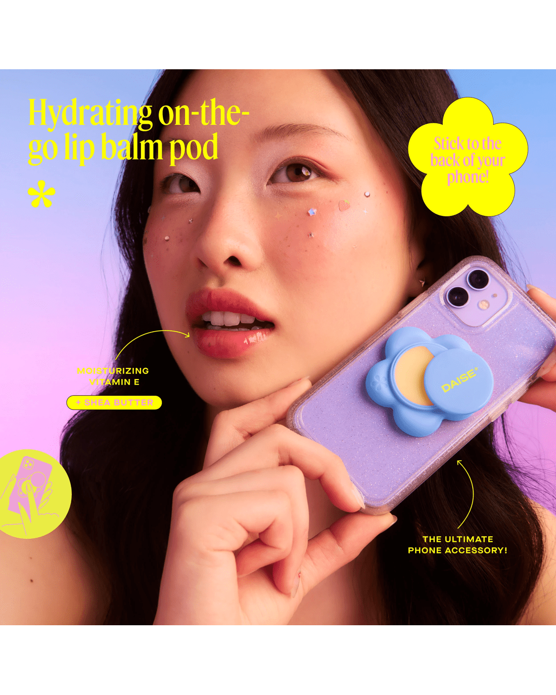 Looking for hydration that goes wherever you go? The DAISE Phone Petal Pod is a super-cute, phone-ready lip balm designed to keep your lips soft, smooth and moisturised anytime, anywhere. With its swivel-open design and stick-to-your-phone backing, this on-the-go essential makes self-care easy, fun and always within reach. Formulated with Vitamin E, Shea Butter, Coconut Oil and Avocado Oil, this non-tinted, non-drying balm delivers 8-hour moisture and a creamy Coconut flavour that boosts your mood with every swipe. The creamy, cushiony texture glides on effortlessly, leaving lips hydrated, conditioned and subtly sweet. Dermatologically tested, 90% natural, cruelty-free and made with our Clean Promise, it’s perfect for everyday use and all skin types. With its playful design and pocket-free convenience, the Phone Petal Pod is as good for your lips as it is for your daily routine.