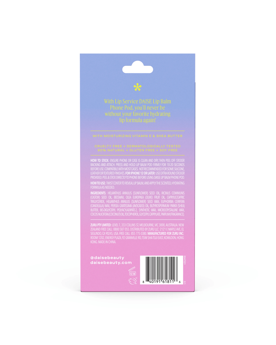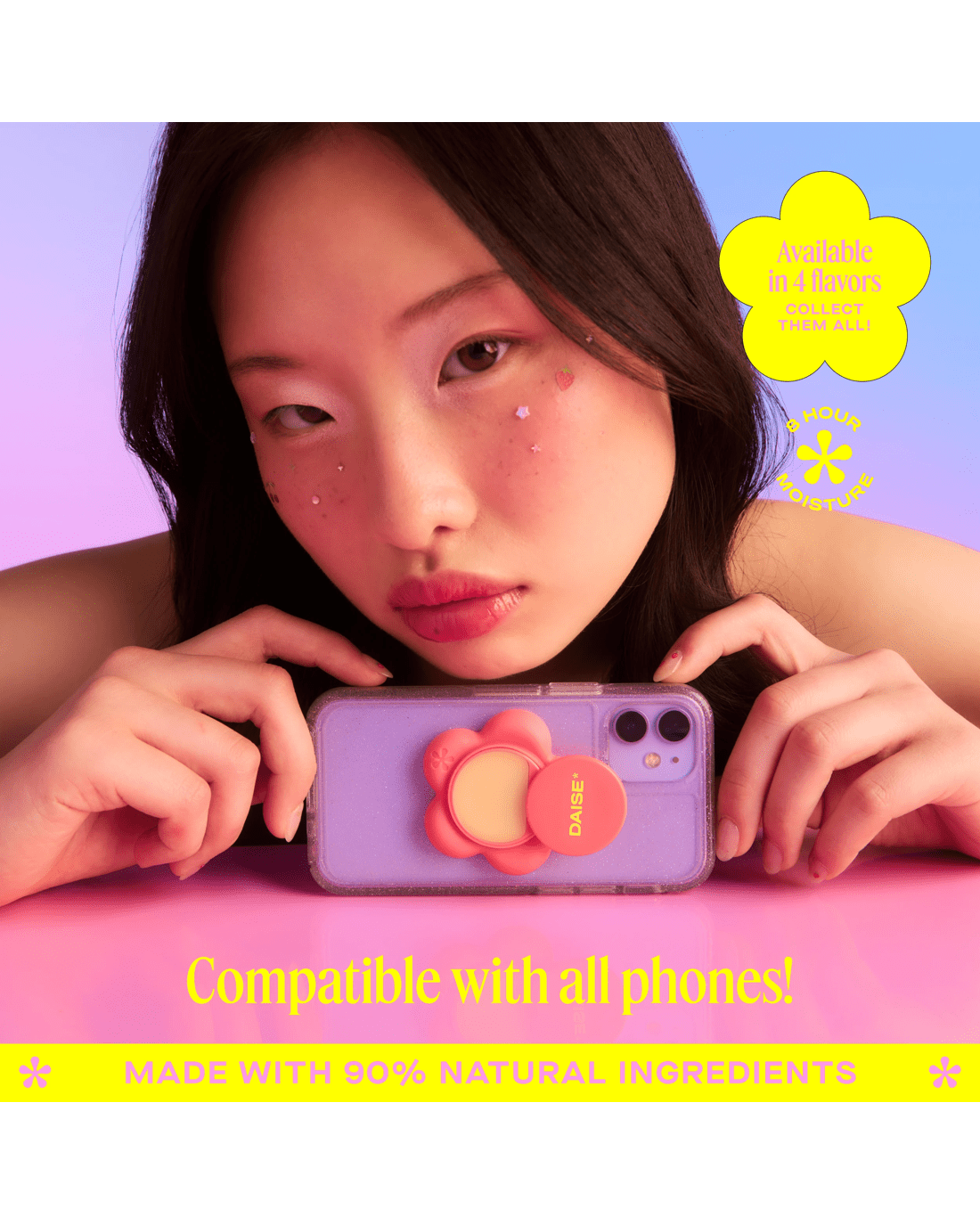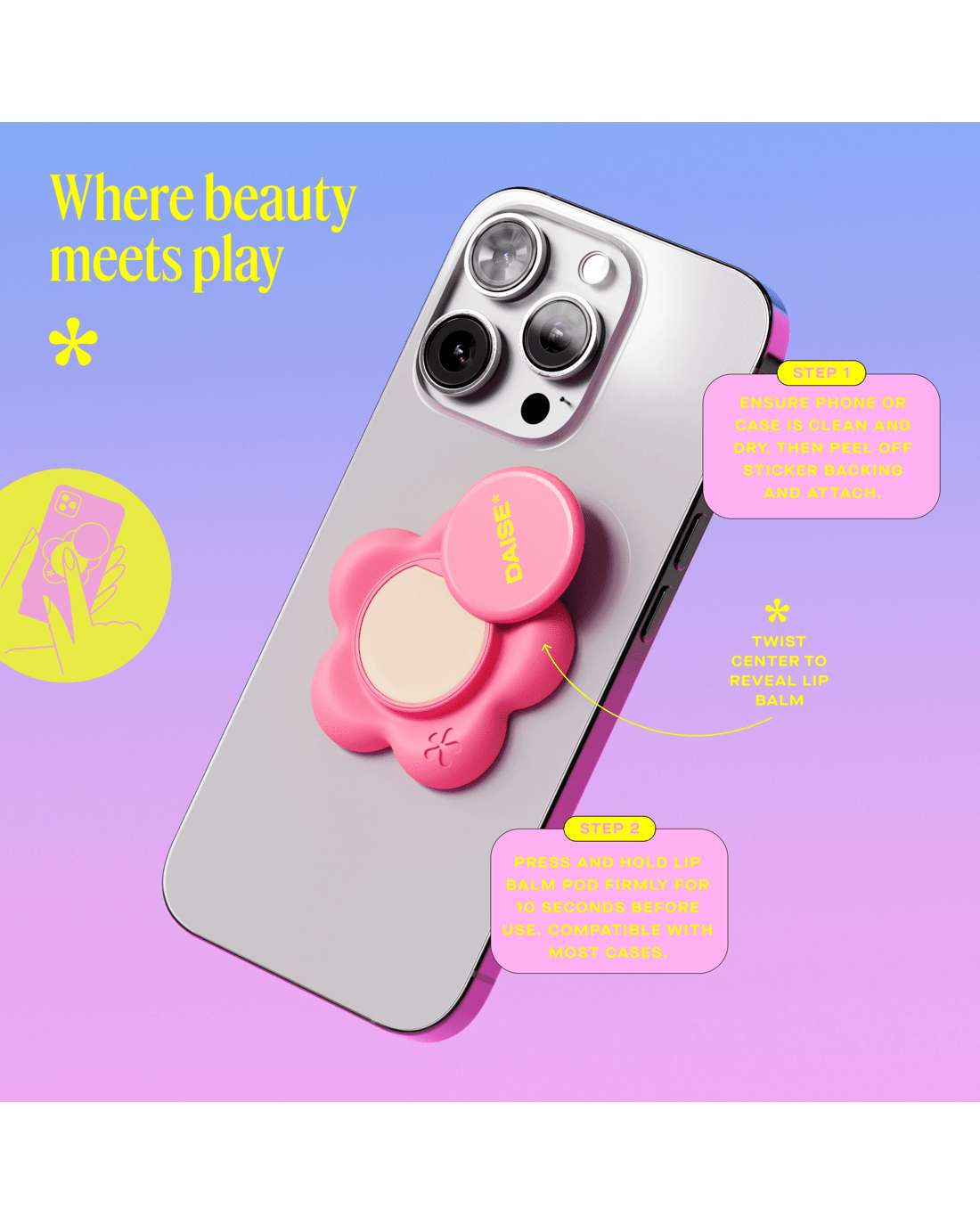 Looking for hydration that goes wherever you go? The DAISE Phone Petal Pod is a super-cute, phone-ready lip balm designed to keep your lips soft, smooth and moisturised anytime, anywhere. With its swivel-open design and stick-to-your-phone backing, this on-the-go essential makes self-care easy, fun and always within reach. Formulated with Vitamin E, Shea Butter, Coconut Oil and Avocado Oil, this non-tinted, non-drying balm delivers 8-hour moisture and a Strawberry flavour that boosts your mood with every swipe. The creamy, cushiony texture glides on effortlessly, leaving lips hydrated, conditioned and subtly sweet. Dermatologically tested, 90% natural, cruelty-free and made with our Clean Promise, it's perfect for everyday use and all skin types. With its playful design and pocket-free convenience, the Phone Petal Pod is as good for your lips as it is for your daily routine.