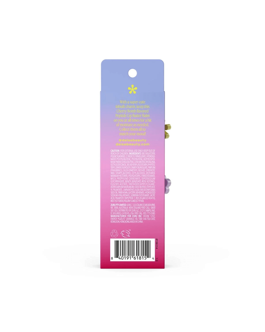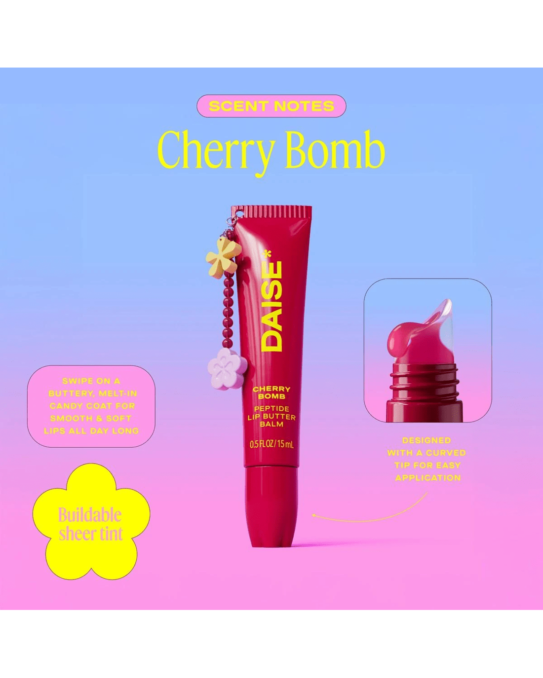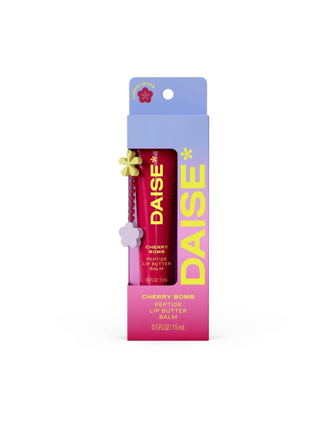 Looking for a lip balm that truly nourishes while providing a light tint? The DAISE Peptide Lip Butter Balm in Cherry Bomb is infused with Peptides, Shea Butter, and Meadowfoam Seed Oil to deeply hydrate, smooth and repair dry or flaky lips. Its rich, non-sticky texture melts in effortlessly, leaving lips butter-soft and naturally radiant through every season. With a subtle cherry scent and buildable sheer tint, it's perfect for everyday wear. Vegan, cruelty-free, dermatologically tested and made with our clean promise, this balm delivers glossy, healthy, hydrated lips all day long. In six juicy flavours, these cute and collectible lip treats are almost good enough to eat: there's Berry Vanilla, Cake Pop, Cherry Bomb, Sugar Bear, Very Vanilla and Hot Mocha. Whatever your vibe, there's a DAISE to match! Collect your favourite flavours and colours to match your mood.