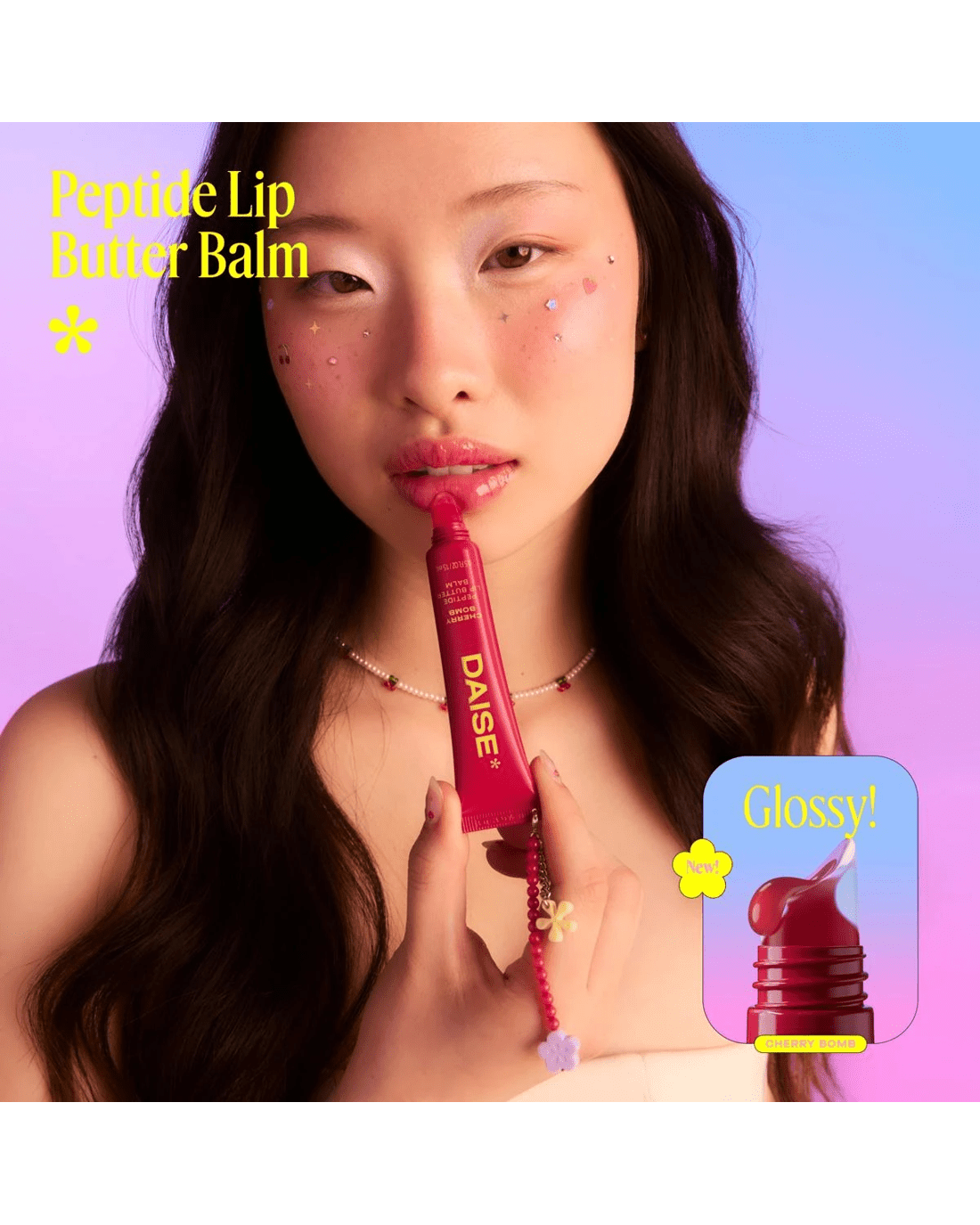 - DAISE peptide lip butter balm in cherry: Glossy, cherry scented balm with a buildable sheer tint for soft, radiant lips