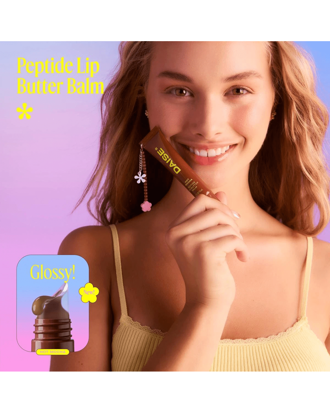 - DAISE peptide lip butter balm in hot mocha: Glossy, mocha scented balm with a buildable sheer tint for soft, radiant lips