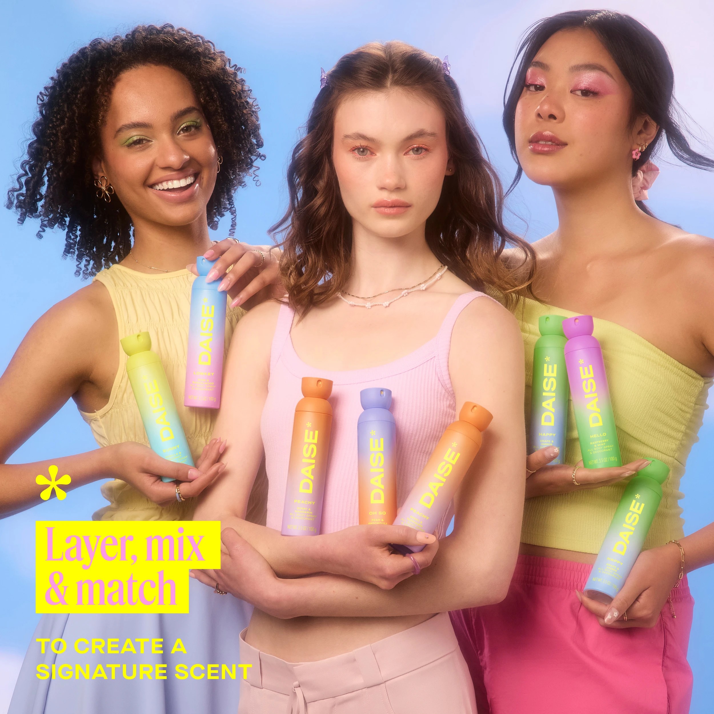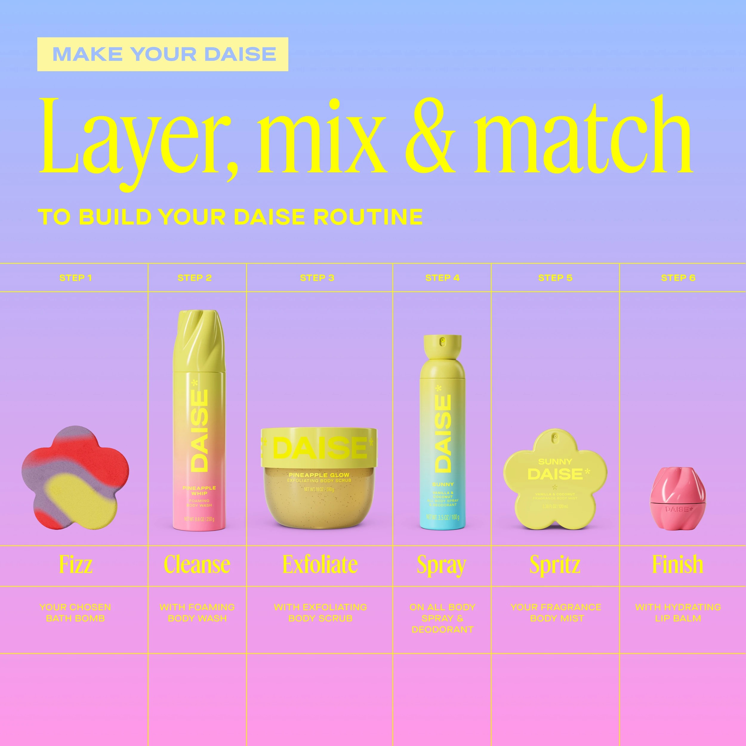 Meet your new all-rounder body spray! DAISE Sunny Daise All Body Spray & Deodorant is designed to keep you feeling confident, cool and cute with a tropical vanilla and coconut scent that can go everywhere. Sunny Daise blends creamy vanilla, coconut, white lily with chamomile with fresh aloe and earthy patchouli-and lasts for up to 24 hours. Dermatologically tested and formulated with our clean promise, this aluminium-free formula is suitable for whole body use every day. Available in six versatile floral- and fruit-forward fragrances, there's Happy Daise (Grape & Amber), Hello Daise (Raspberry & Mint), Lowkey Daise (Rose & Sandalwood), Oh So Daise (Pear & Patchouli), Peachy Daise (Berry & Mandarin) and Sunny Daise (Vanilla & Coconut). Spray based on your mood, layer them to craft your signature scent, or mix-and-match to create a totally new DAISE.