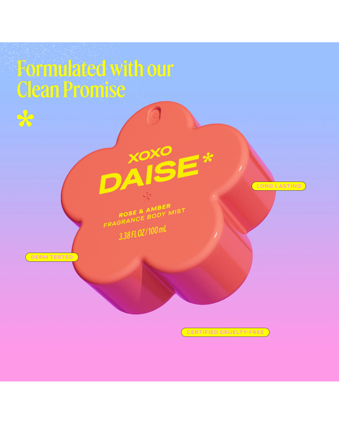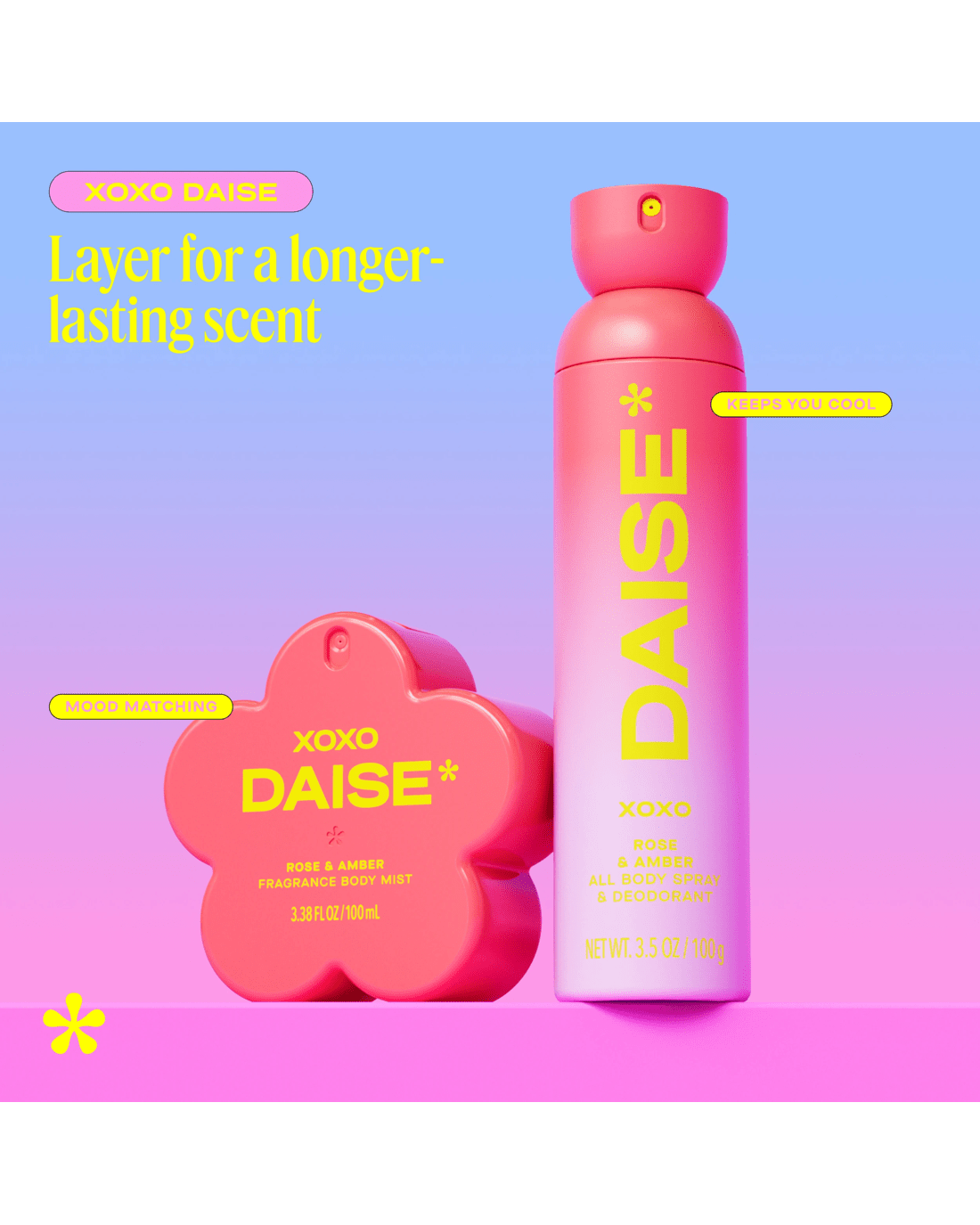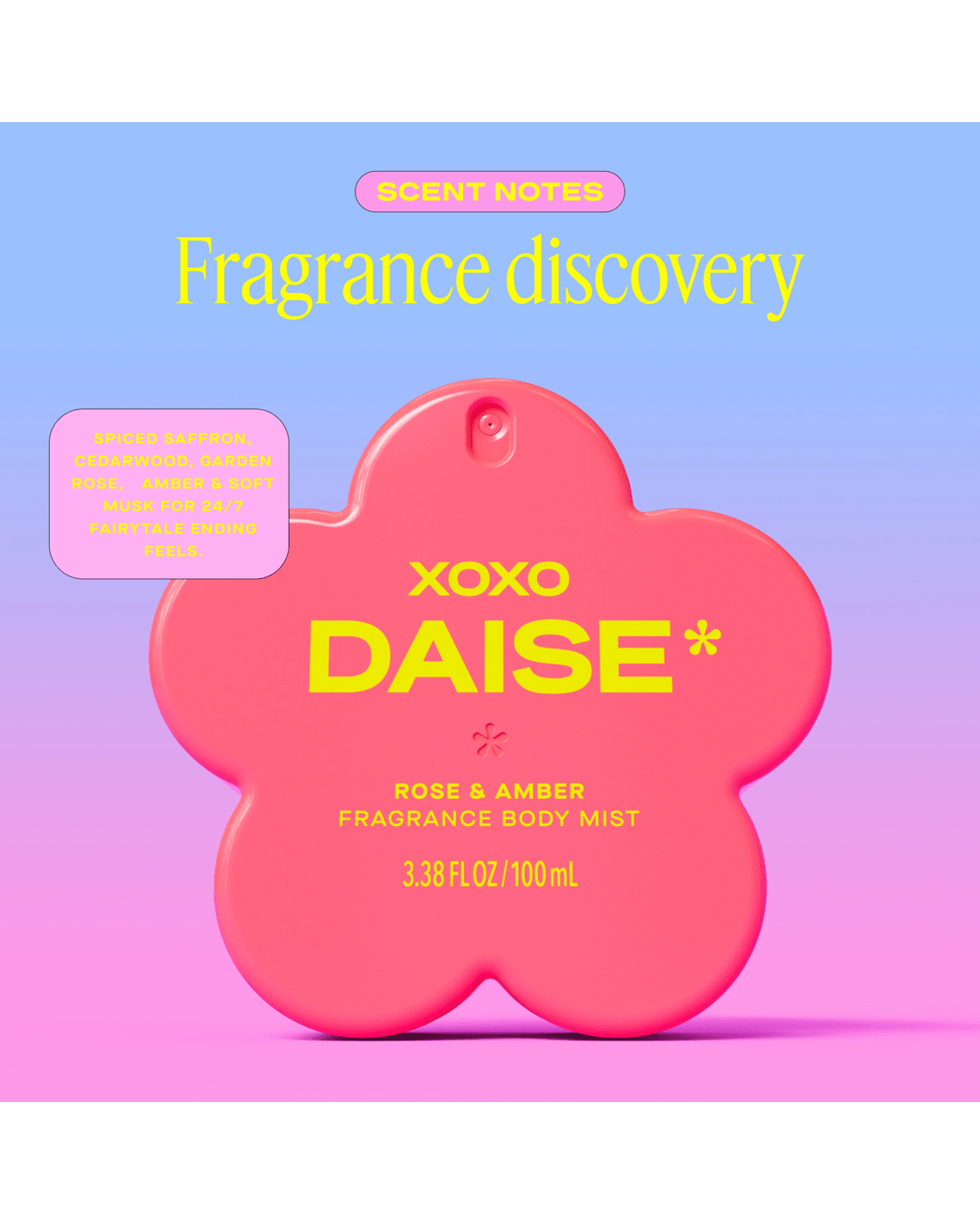 • DAISE XOXO fragrance body mist: Rose & amber scented body mist with a playful, mood-lifting twist