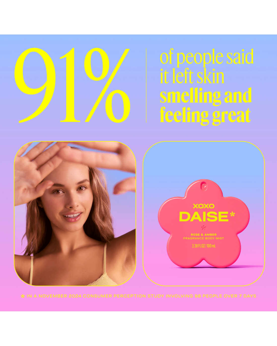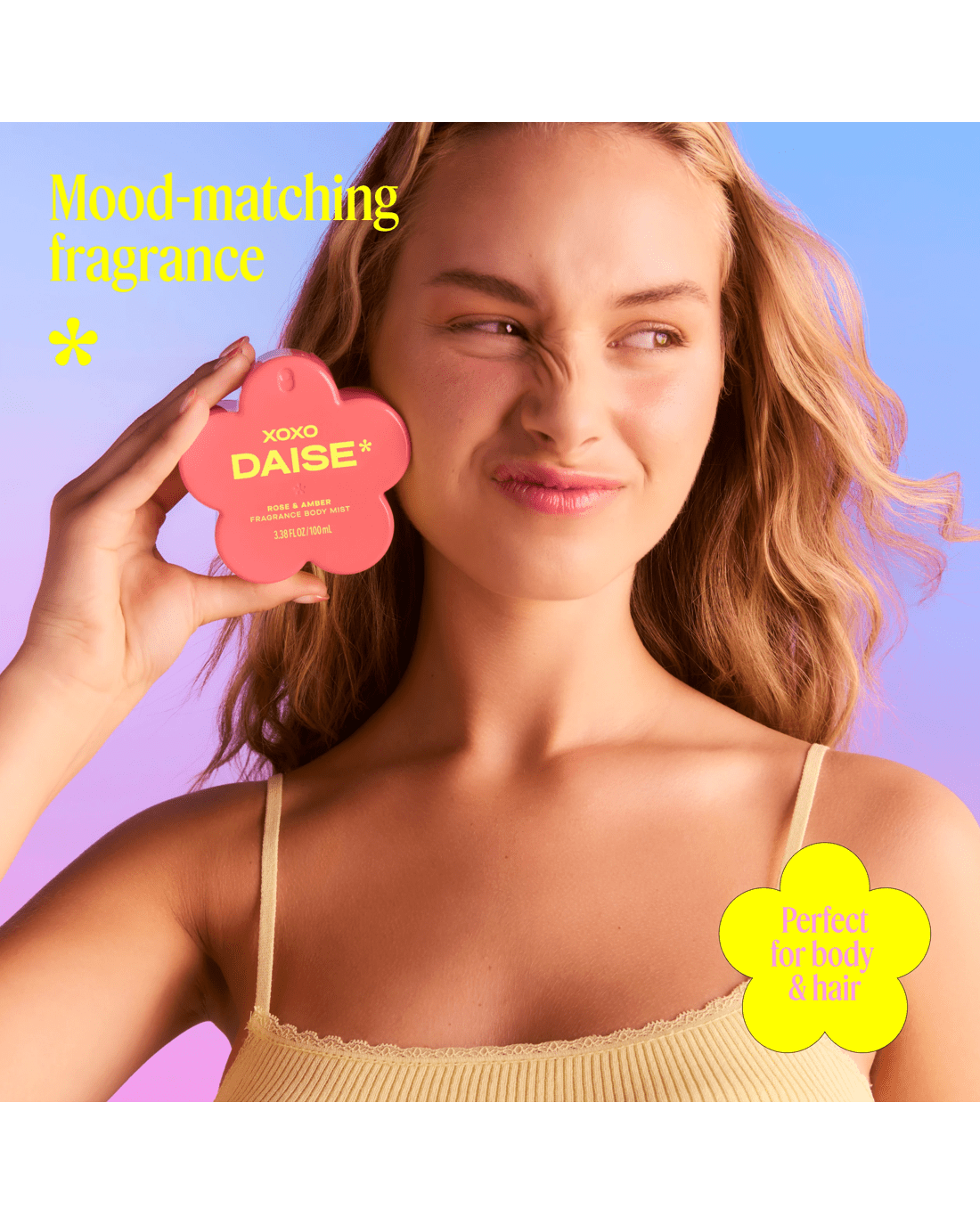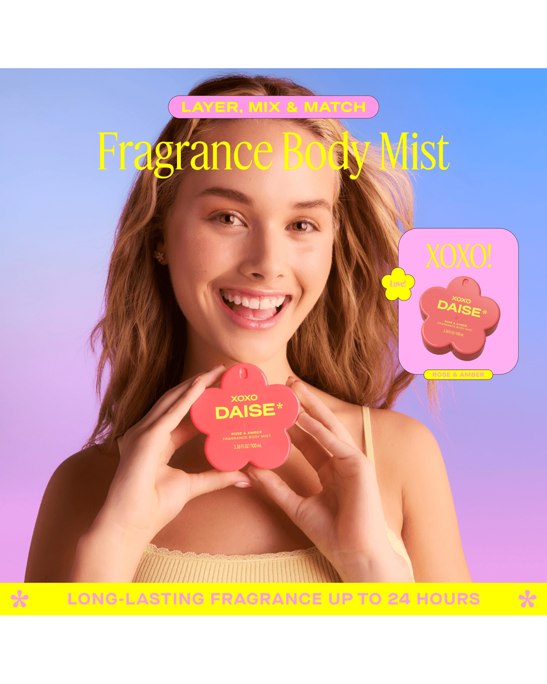 • DAISE XOXO fragrance body mist: Rose & amber scented body mist with a playful, mood-lifting twist