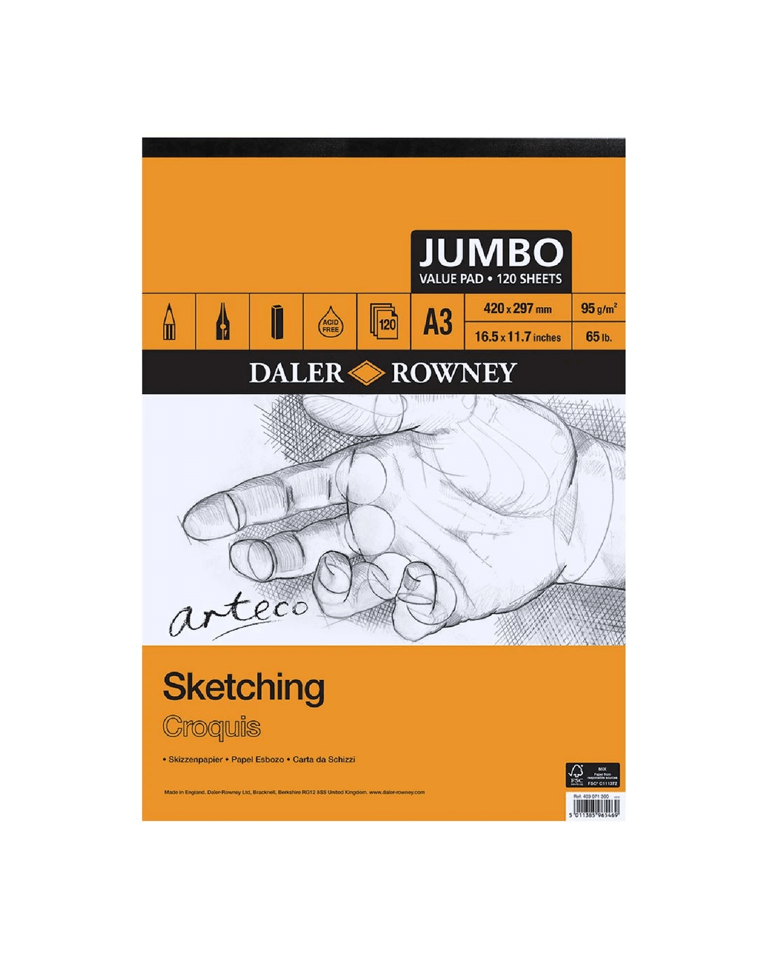This Daler-Rowney Arteco Jumbo Pad contains medium grain cream paper ideal for drawing, sketching and writing. The pages are thick and acid free so they won't yellow or discolour over time.