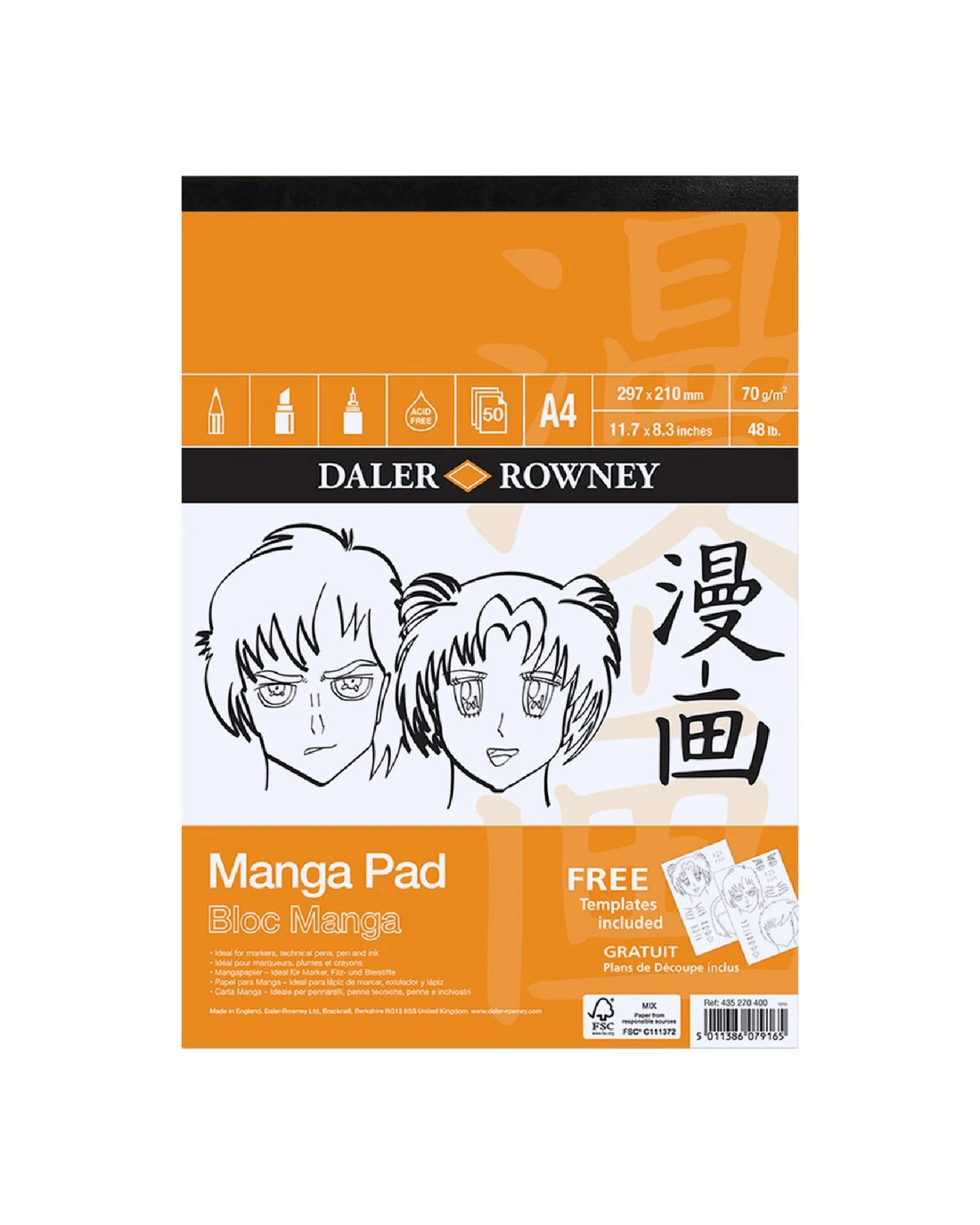 This Daler-Rowney Manga Pad contains 70 gsm paper which is ideal for use with marker pens, technical pens and ink. It includes 2 template pages with instructions and examples of hair drawing techniques so you can learn as you create. Plus, there are male and female characters to trace giving you a great starting point.