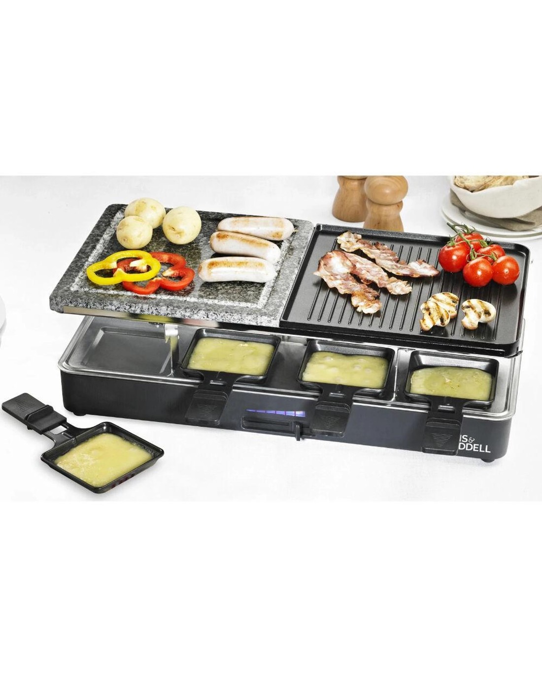 The reversible grill plate features one flat surface and one ribbed side, plus moulds for eggs or pancakes. Underneath, eight non-stick mini pans allow guests to melt cheese or warm bites at their own pace.