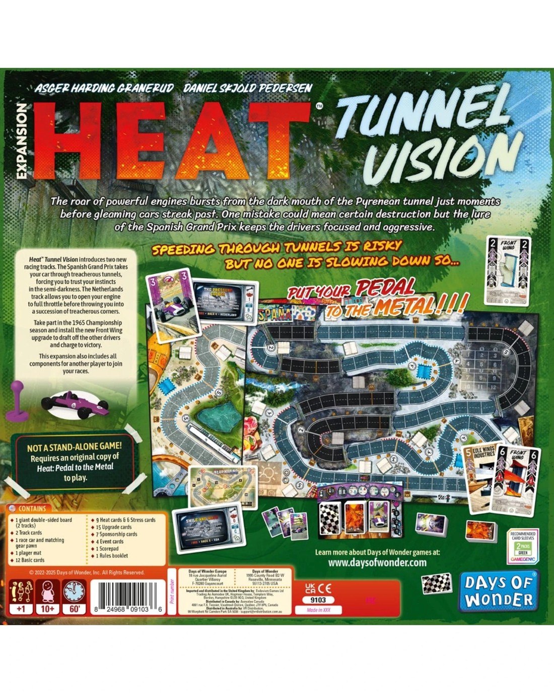 Chicanes and tunnels, front wing upgrades, and maps for Spain and Netherlands. The roar of powerful engines bursts from the dark mouth of the Pyrenean tunnel just moments before gleaming cars streak past. One mistake could mean certain destruction, but the lure of the Spanish Grand Prix keeps the drivers focused and aggressive. This expansion introduces: Heat Tunnel Vision introduces two new racing tracks. The Spanish Grand Prix takes your car through treacherous tunnels, forcing you to trust your instincts in the semi-dark. The Netherlands track allows you to open your engine to full throttle before throwing you into a succession of treacherous corners. Take part in the 1965 Championship season and install the new Front Wing upgrade to draft off the other drivers and charge to victory. This second expansion brings captivating new mechanics: Chicanes and Tunnels for more technical and high-intensity races, Front Wing Upgrade Cards, New Event Cards, and expands the player count to 7 (8 with the Heavy Rain expansion). Ages: 10 + | Players: 1 - 7 | Playtime: 60 mins