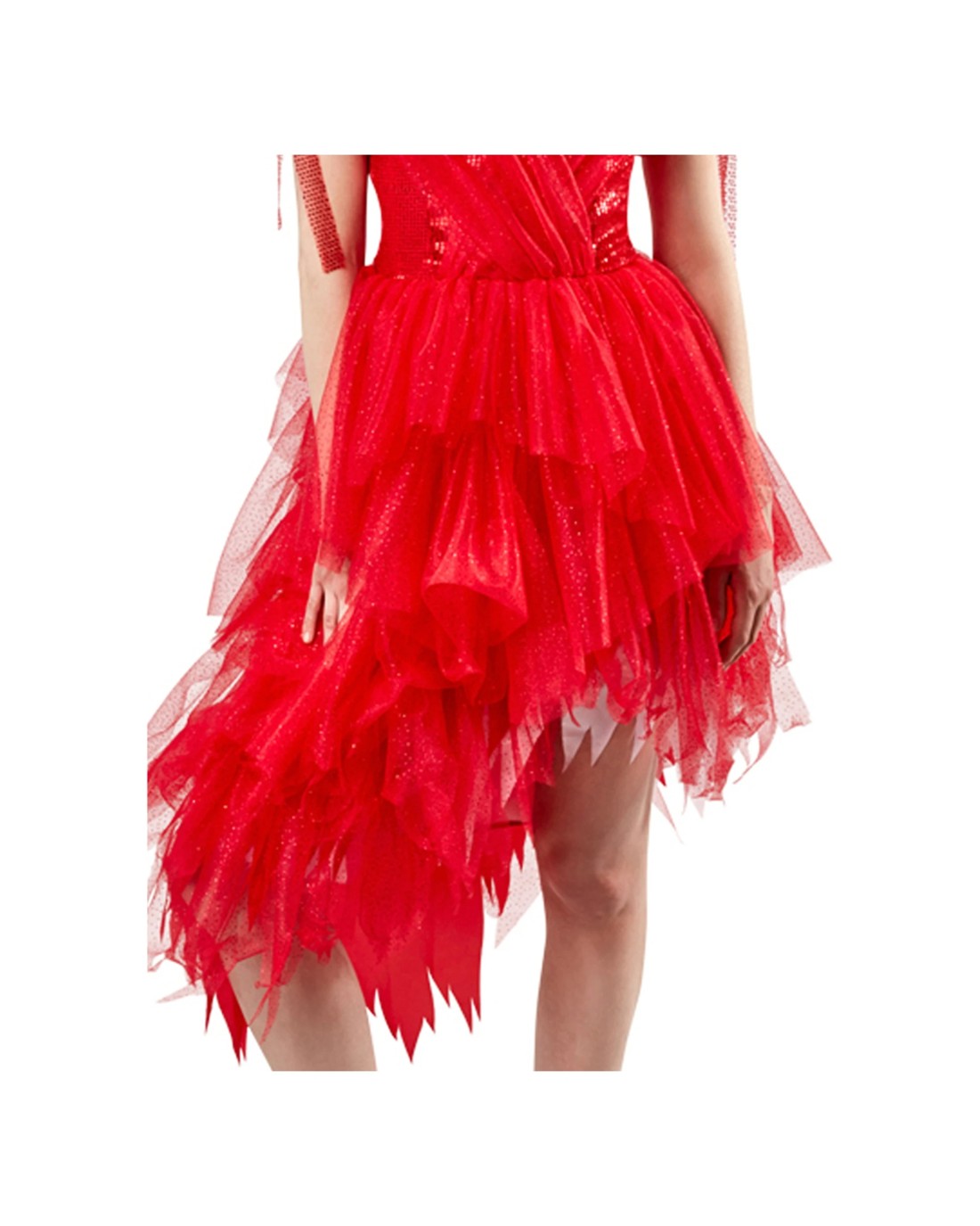 - Design: Red halter neck dress with tattered hem and crossover bodice