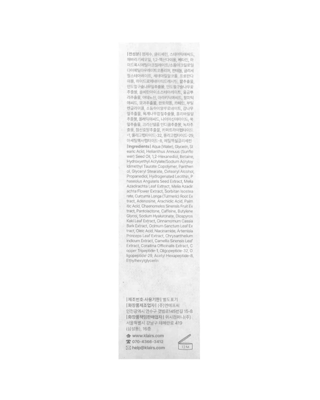 • Ingredients: Aqua (Water), Glycerin, Stearic Acid, 1,2-Hexanediol, Helianthus Annuus (Sunflower) Seed Oil, Betaine, Caffeine, Phaseolus Angularis Seed Extract, Artemisia Princeps Leaf Extract, Camellia Sinensis Leaf Extract, Chaenomeles Sinensis Fruit Extract, Chrysanthellum Indicum Extract, Cinnamomum Cassia Bark Extract, Corallina Officinalis Extract, Curcuma Longa (Turmeric) Root Extract, Diospyros Kaki Leaf Extract, Melia Azadirachta Flower Extract, Melia Azadirachta Leaf Extract, Ocimum Sanctum Leaf Extract, Acetyl Hexapeptide-8, Copper Tripeptide-1, Oligopeptide-29, Oligopeptide-32, Panthenol, Pantolactone, Hydrogenated Lecithin, Hydroxyethyl Acrylate/Sodium Acryloyldimethyl Taurate Copolymer, Sodium Hyaluronate, Glyceryl Stearate, Sorbitan Isostearate, Cetearyl Alcohol, Propanediol, Arachidic Acid, Oleic Acid, Palmitic Acid, Caprylyl/Capryl Glucoside, Ethylhexylglycerin