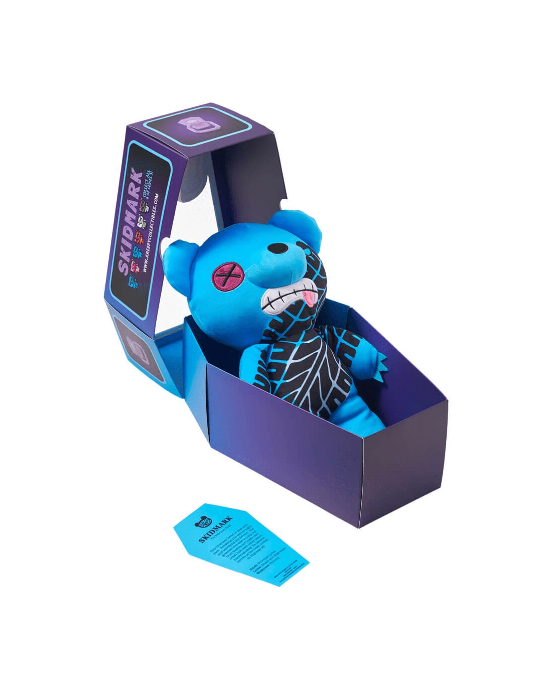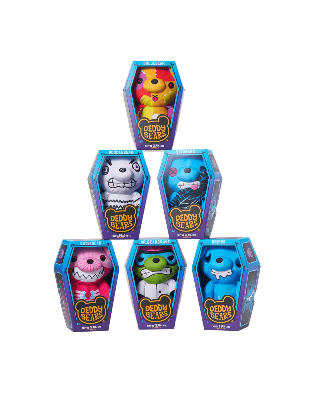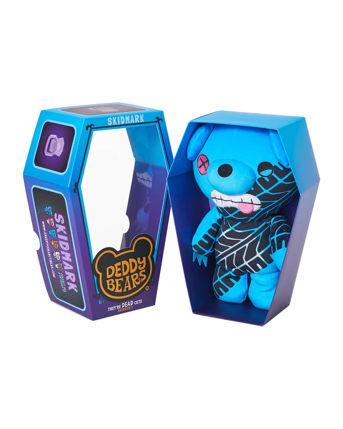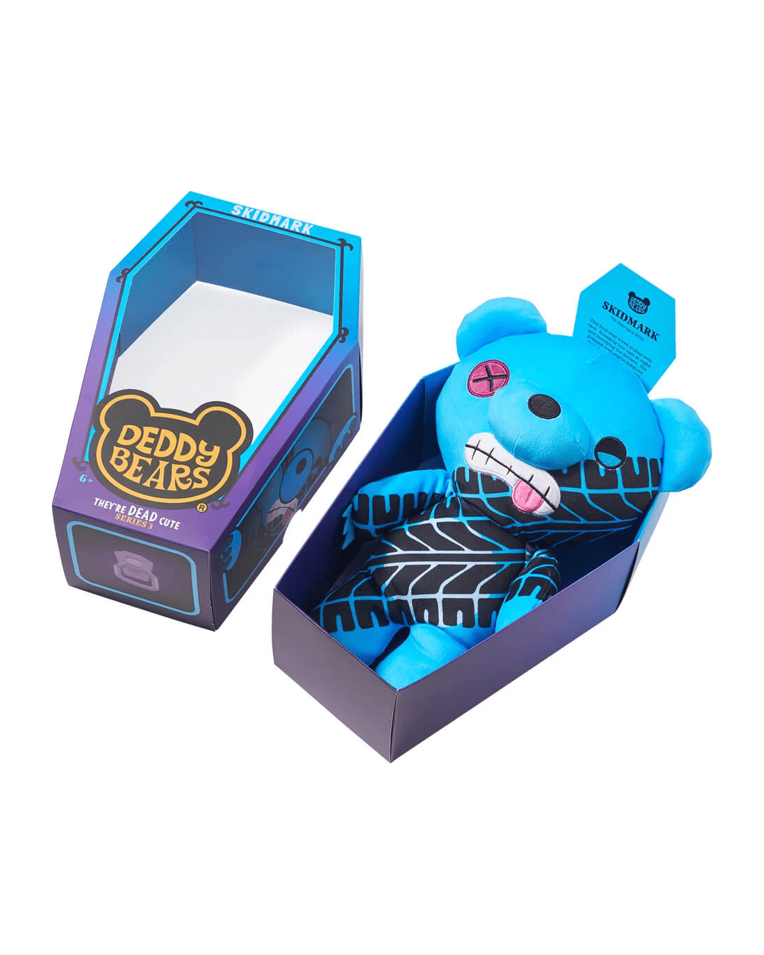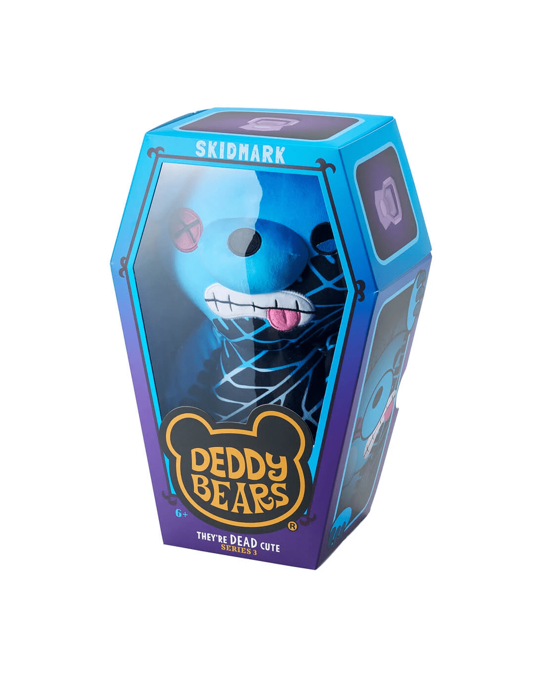 Deddy Bears are impulsive, fun, and super scary! The 30cm Skidmark plush comes complete with a death certificate with unique character information. Covered in soft fur and features embroidered details. Presented in a large coffin. Deddy Bears are perfect for tweens, collectors, and fright fans alike. The Deddy Bears Series 3 characters include Dr. Beargrave, Skidmark, Bulgebear, Doodlebear, Gutsybear and Dripps.