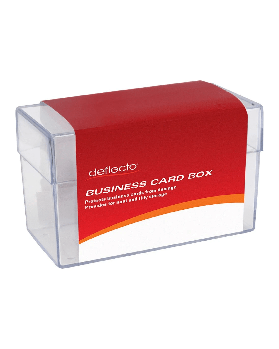 Keep your business cards neat and tidy in this large Deflecto Business Card Storage Box. The box is crafted from a durable plastic that protects business cards and has a fitted lid so that your cards will keep together if the box is knocked around. This box is large enough to hold 135 cards but small enough so that you can keep it on your desk or on your person.
