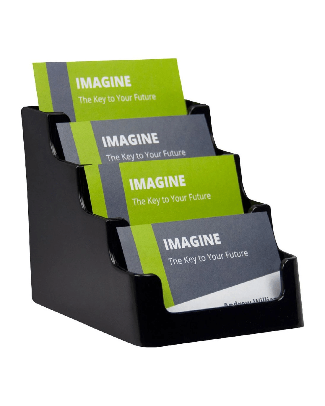 Use the Deflecto Recycled Business Card Holder to prominently display a variety of cards. It has a 4 tiered design so you can display muliple cards at once.