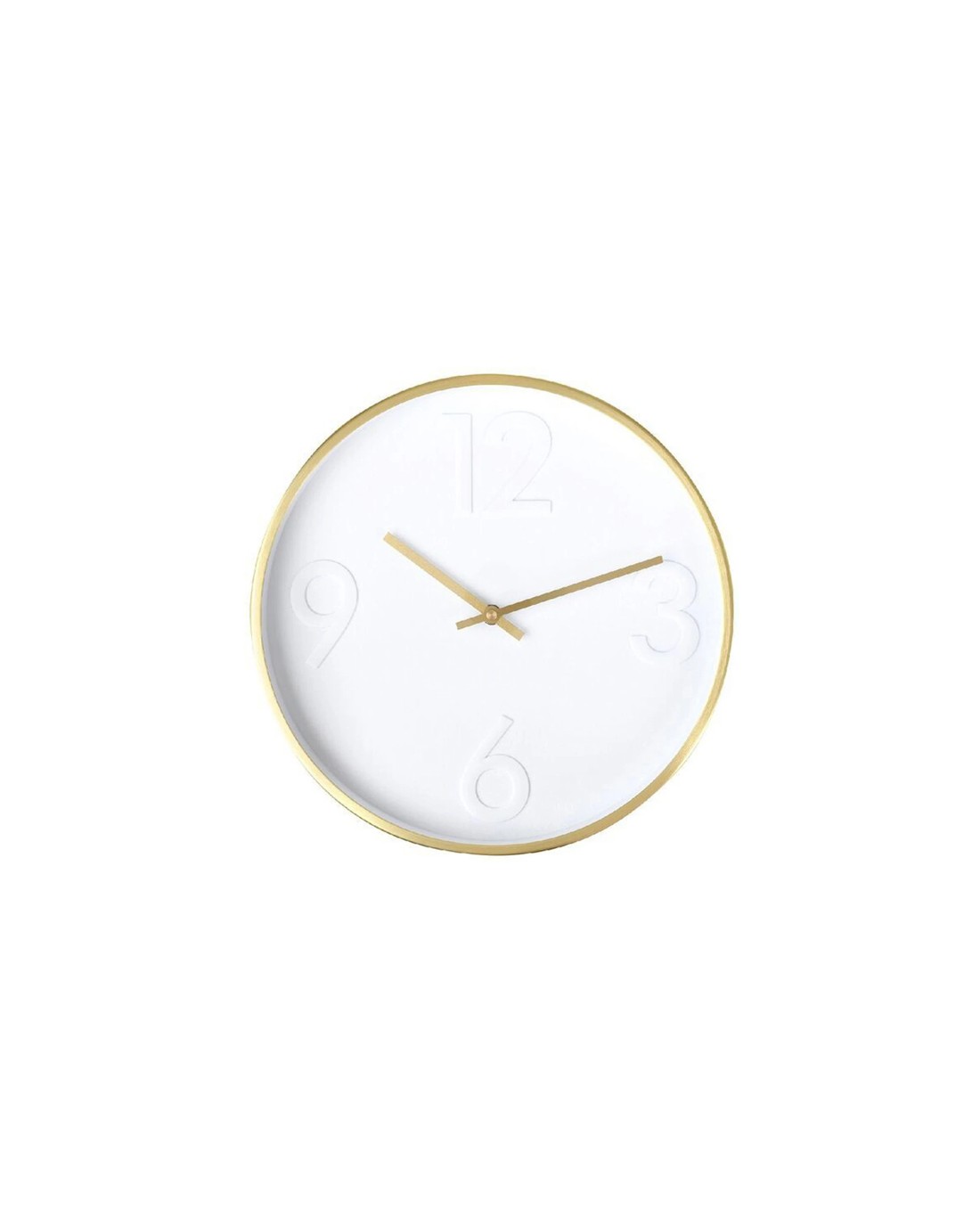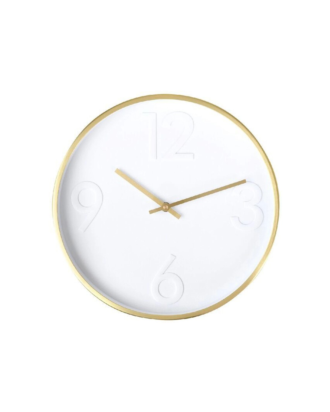This clock features a sturdy metal case with a matte gold finish and a white face, combining durability with a sleek, contemporary aesthetic. The minimalist design includes embossed numerals at 12, 3, 6, and 9, with subtle markings for the other hours, complemented by matching gold hands for a cohesive look.