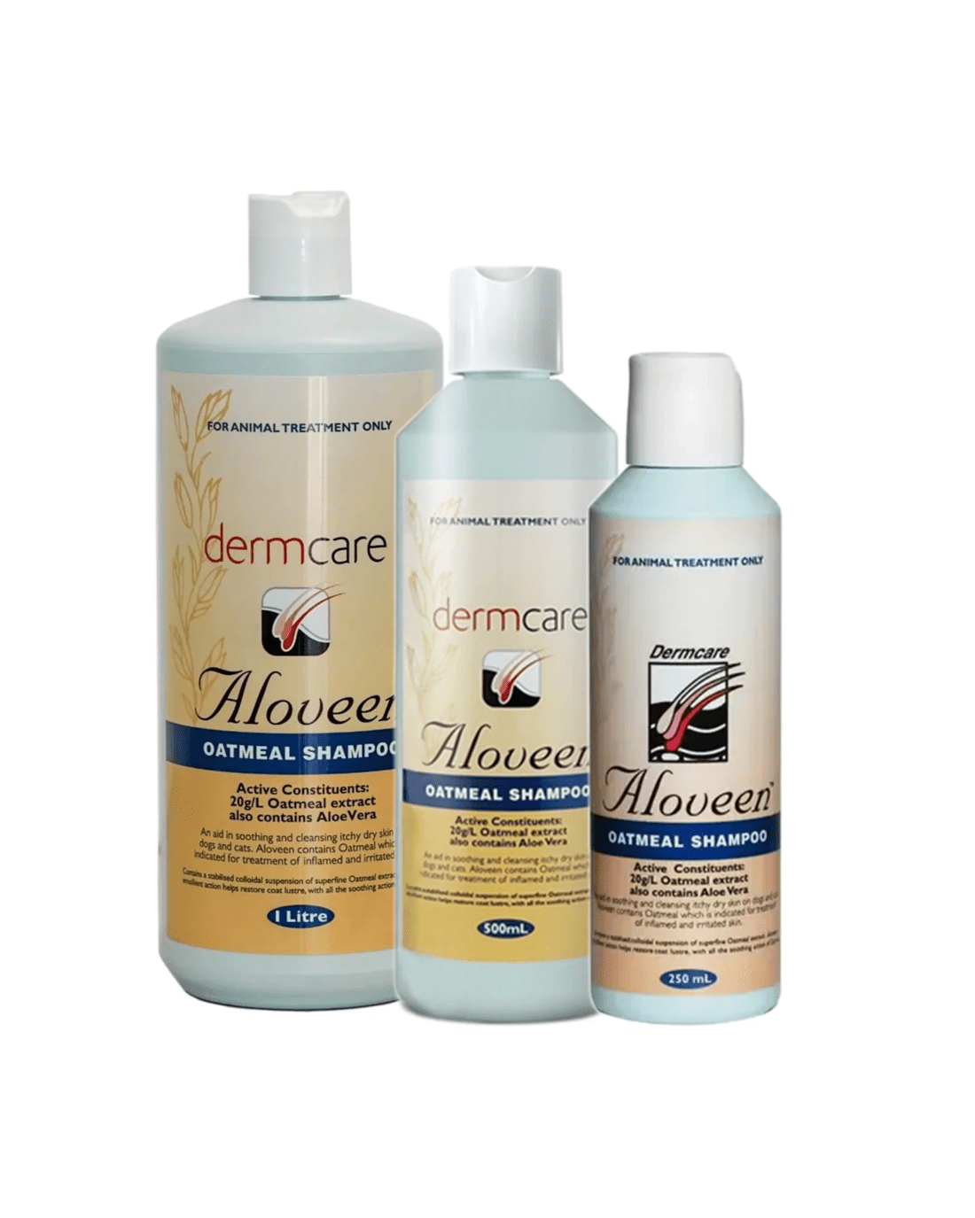 Dermcare Aloveen Oatmeal Shampoo and Aloveen Oatmeal Intensive Conditioner are formulated with extracts of oatmeal in an aloe vera gel base. Their emollient action helps restore coat lustre and provides soothing relief through the natural benefits of oatmeal.