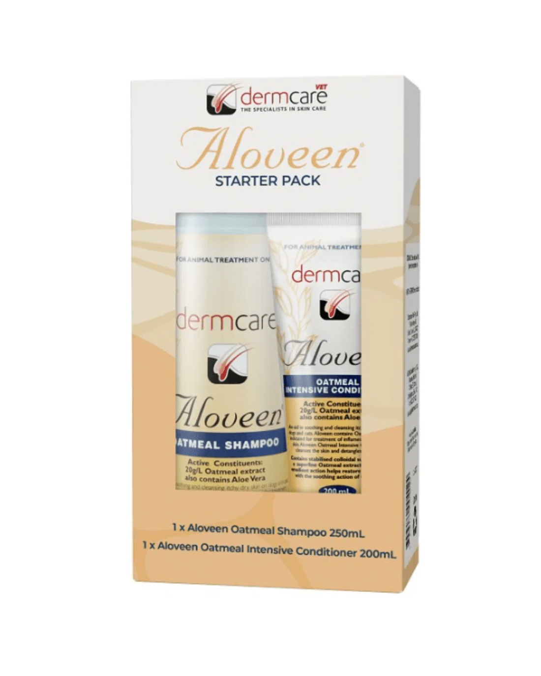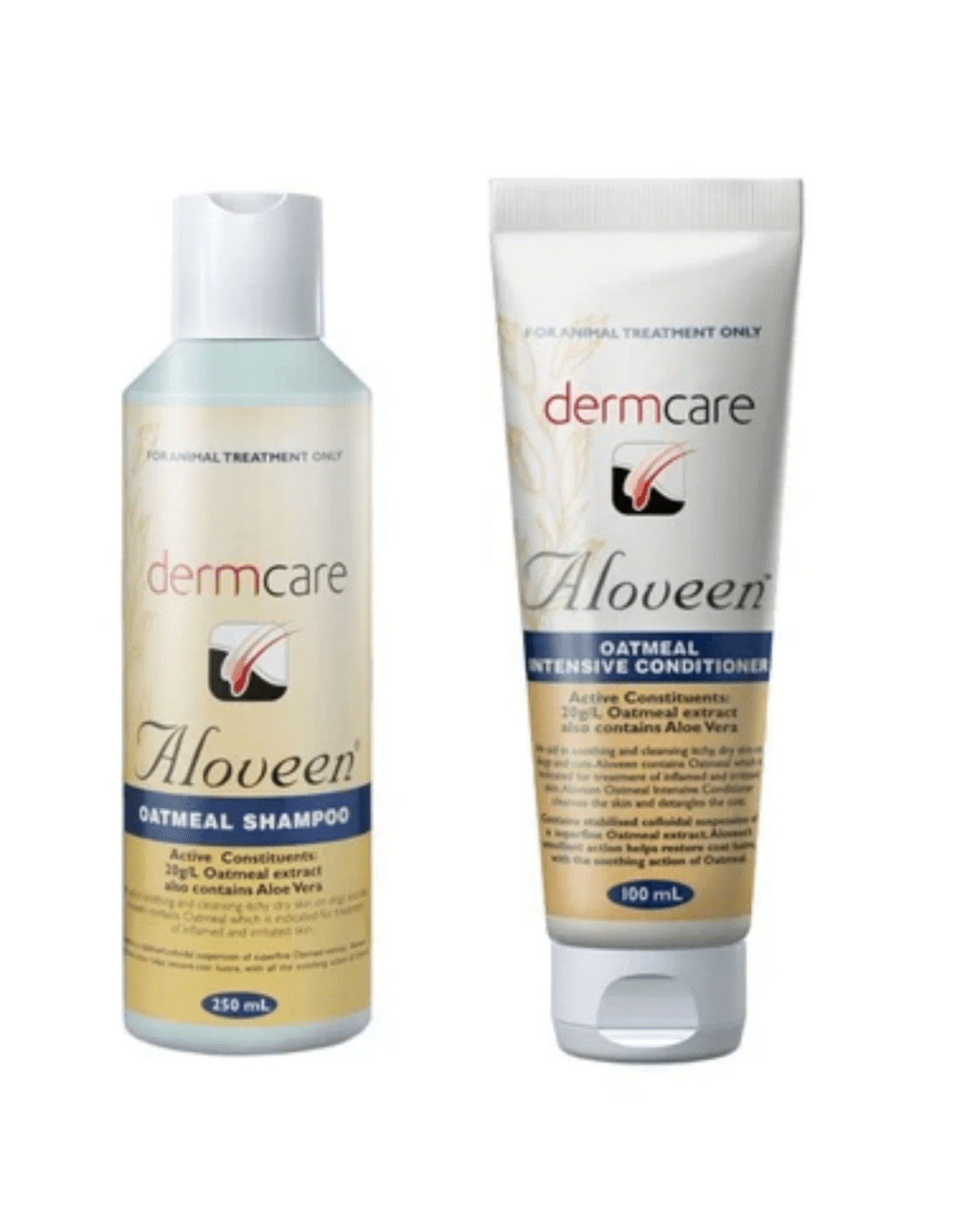 Aloveen Shampoo and Conditioner are specially formulated for dogs and cats with dry, itchy, or sensitive skin. Made with natural oatmeal extracts, they gently cleanse while restoring moisture to your pet’s coat, leaving it soft, shiny, and lightly fragranced.