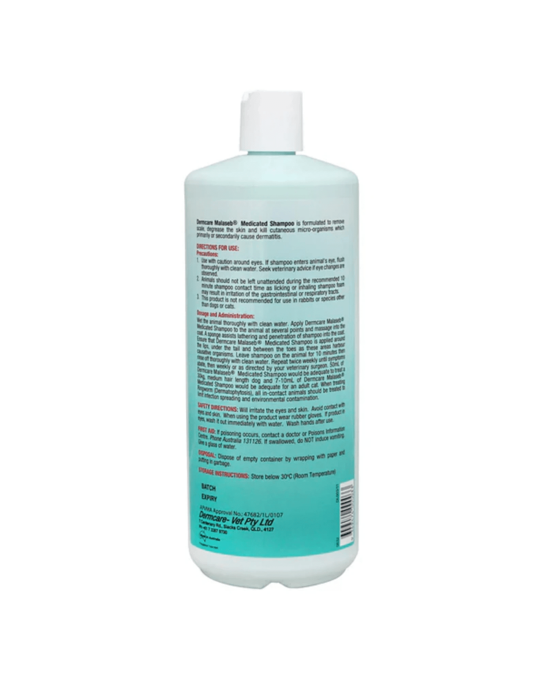 Dermcare Malaseb Medicated Shampoo is formulated to treat Seborrhoeic Dermatitis and aid in the treatment of Dermatophytosis (ringworm) in pets. Seborrhoeic Dermatitis is a bacterial and yeast skin infection, while Dermatophytosis is a contagious fungal disease affecting the skin and coat.