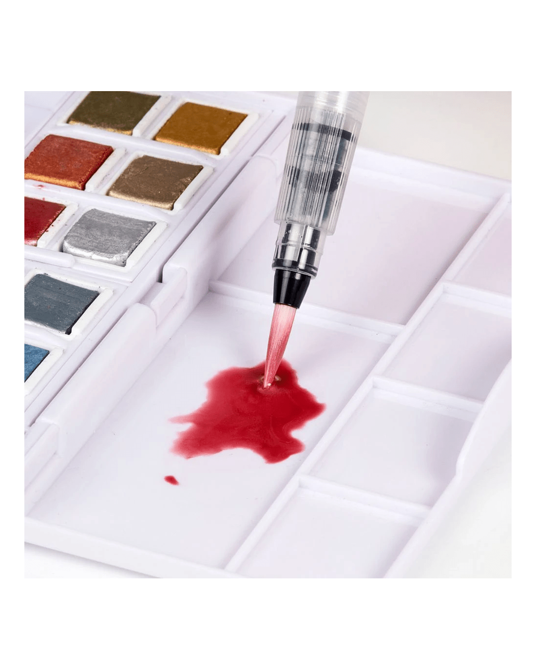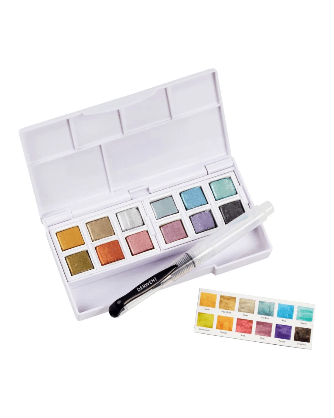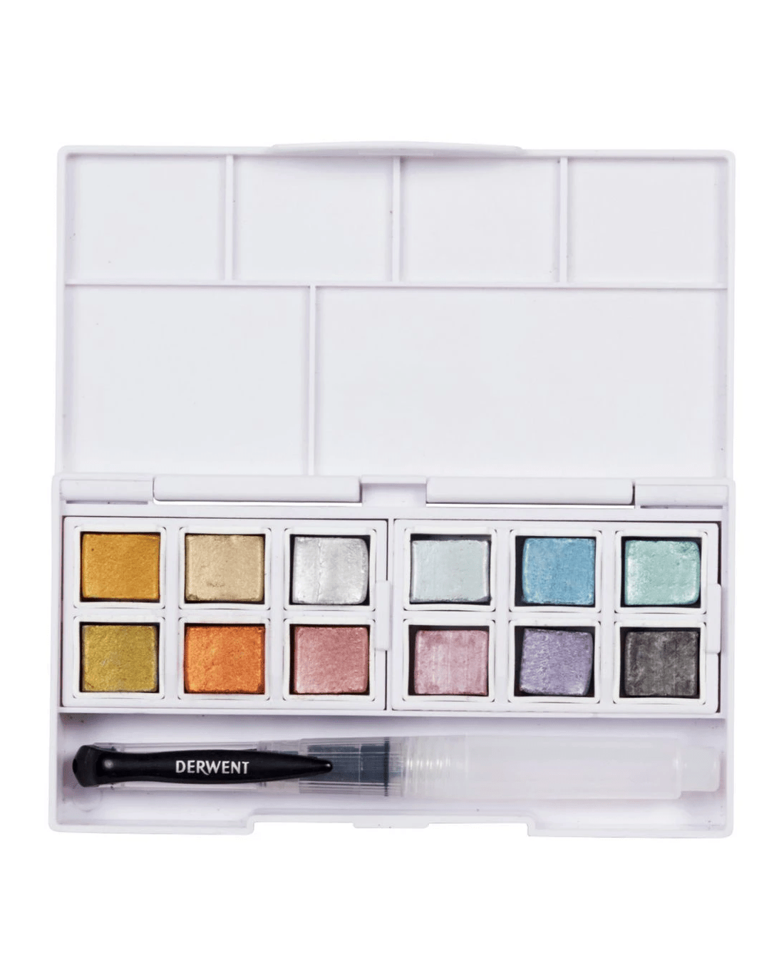 These Derwent Metallic Paint Pans offer a wide spectrum of colours from light silver to deep graphite, to add a reflective glint to any watercolour artwork. The light-catching pigments work effectively on both light and dark paper.