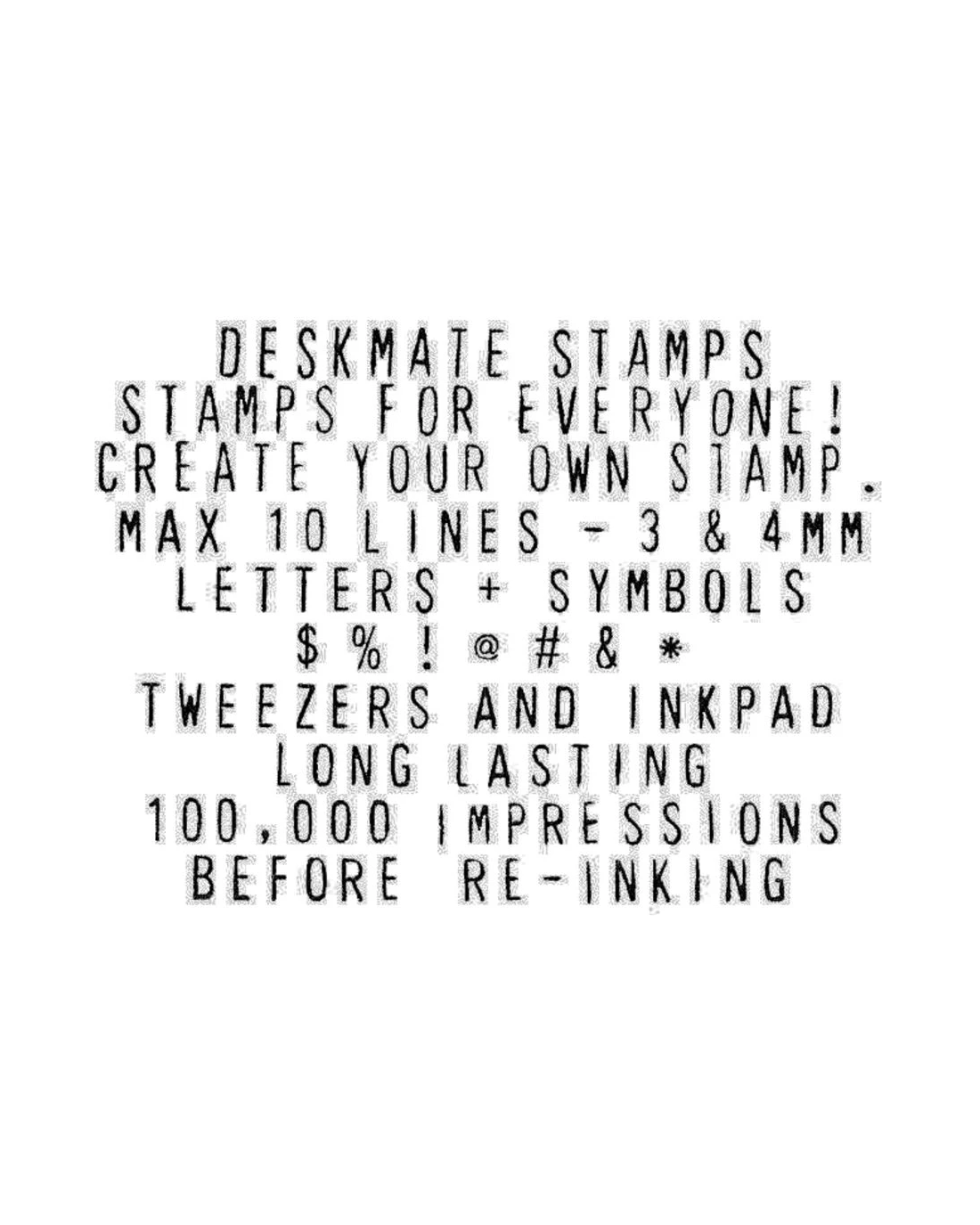 Create the stamp you want with the Deskmate DIY Stamp Kits 10 Lines 3 and 4 mm. Personalise this stamp using up to 10 lines of text, with 22 characters per line with 3 mm text and 21 characters with 4 mm text. There are uppercase letters, numbers and symbols included in this kit so you can effectively get your messages across.