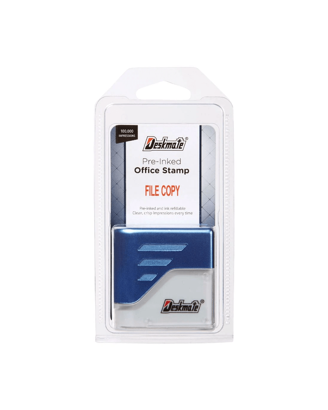 Deskmate Pre-Inked Office Stamps are durable, reliable and suitable for high volume office use. The stamps provide approximately 100,000 sharp impressions and can easily be reinked when necessary.
