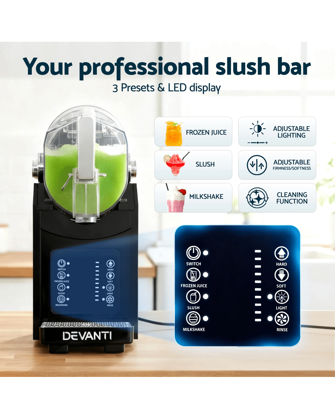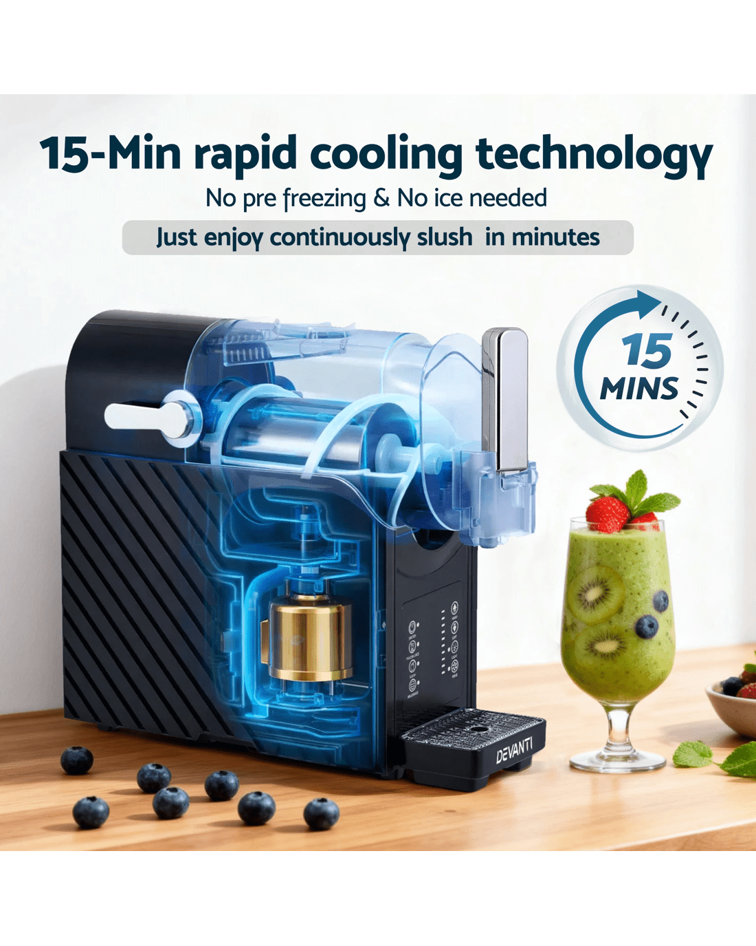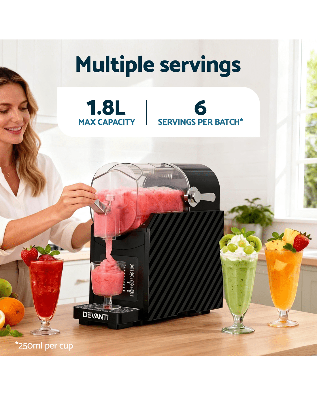 Devanti Slushie Machine Maker churns out serves of smooth-as treats—no pre freezing needed! Ideal for summer scorchers, kids' parties, or a cheeky dessert, it's dead simple to use and a breeze to clean. Just chuck in your ingredients, press go, and you're sorted!