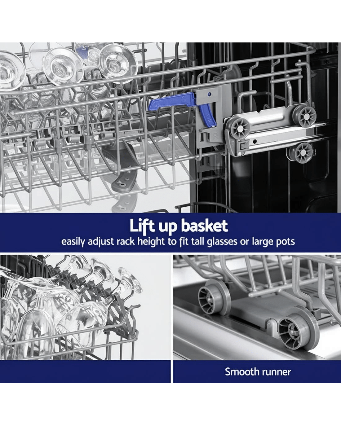Lift up basket, easily adjust rack height to fit tall glasses or large pots.