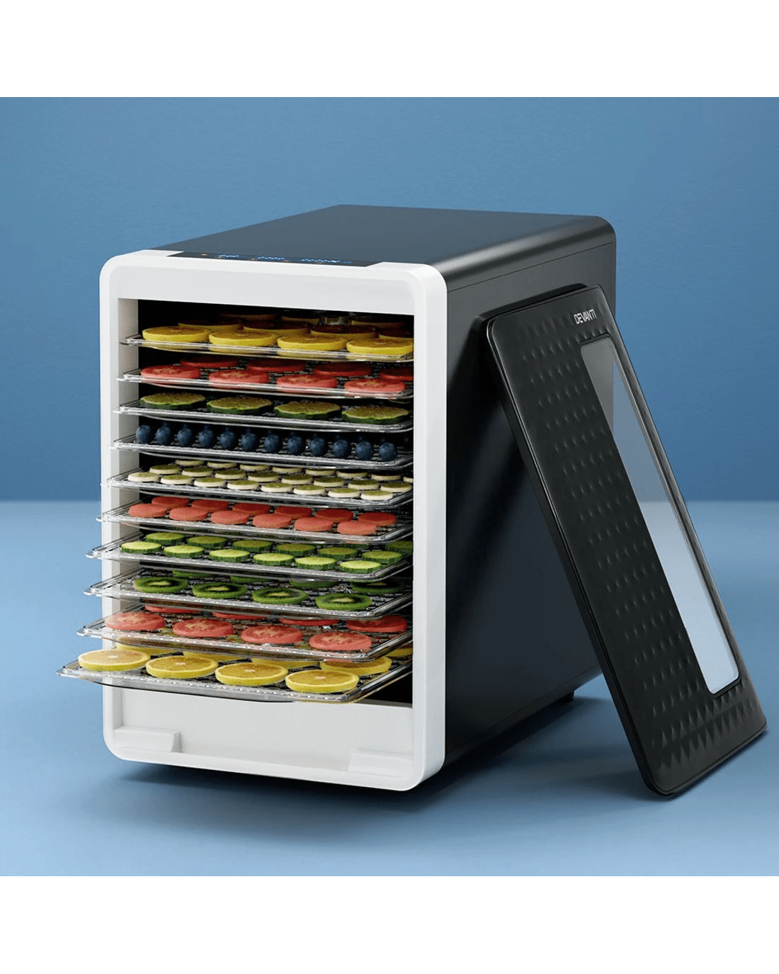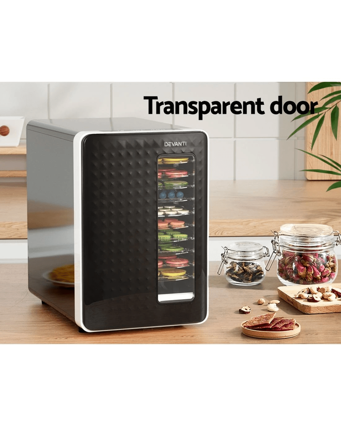 Make healthy snacks at home with the Devanti 10-tray Food Dehydrator. Our food dehydrator will allow you to enjoy dried fruits and vegetables as tasty treats with a long shelf life. Made from food-grade ABS plastic, our food dehydrator features a complete drying system with all the necessary controls to effectively dry vegetables, fruits, herbs, meat and more. The LED touch control panel will allow you to easily operate the dehydrator. Adjust the thermostat between 40 to 70 degrees and set a timer from 1 to 48 hours, then simply rest and wait. The flame-retardant transparent door prevents heat loss and also helps you to monitor the drying process. And when it's done, the trays can be removed for easy cleaning and adjustments. Anti-slip feet keep the machine stable on your bench, and the quiet operation will ensure it never disturbs your rest or play. Best of all, with low energy consumption, the machine will save you on energy costs as well as food wastage. Preserve your food for longer and enjoy healthy and crunchy snacks with the Devanti 10-Tray Food Dehydrator.