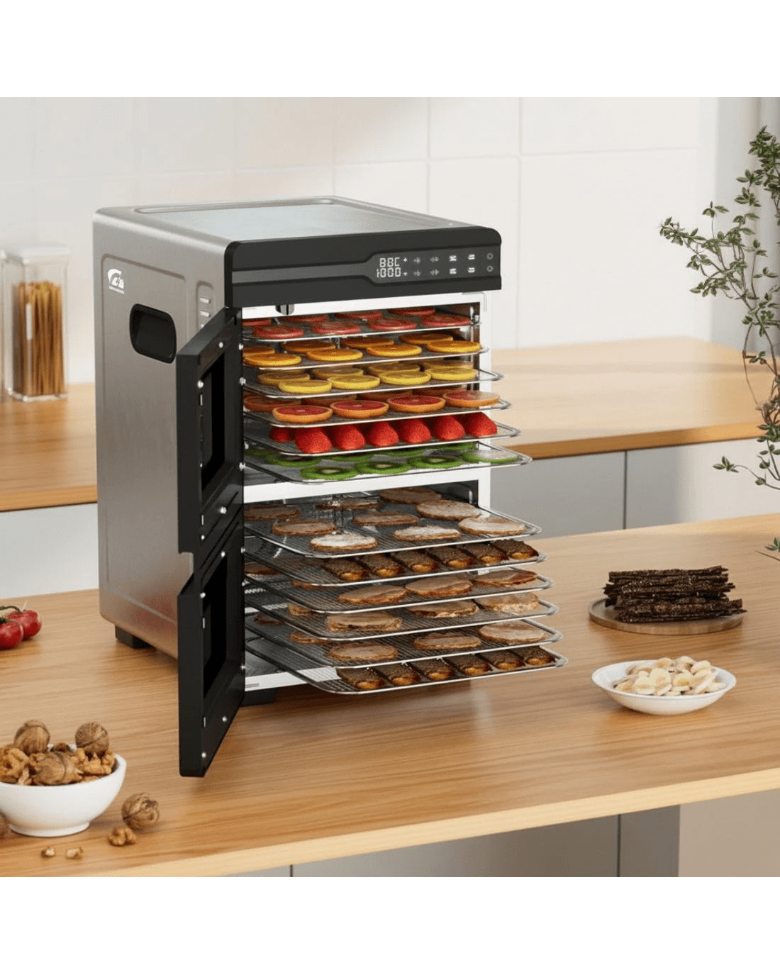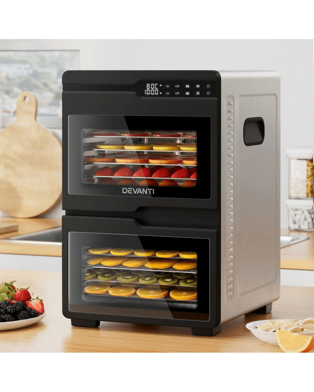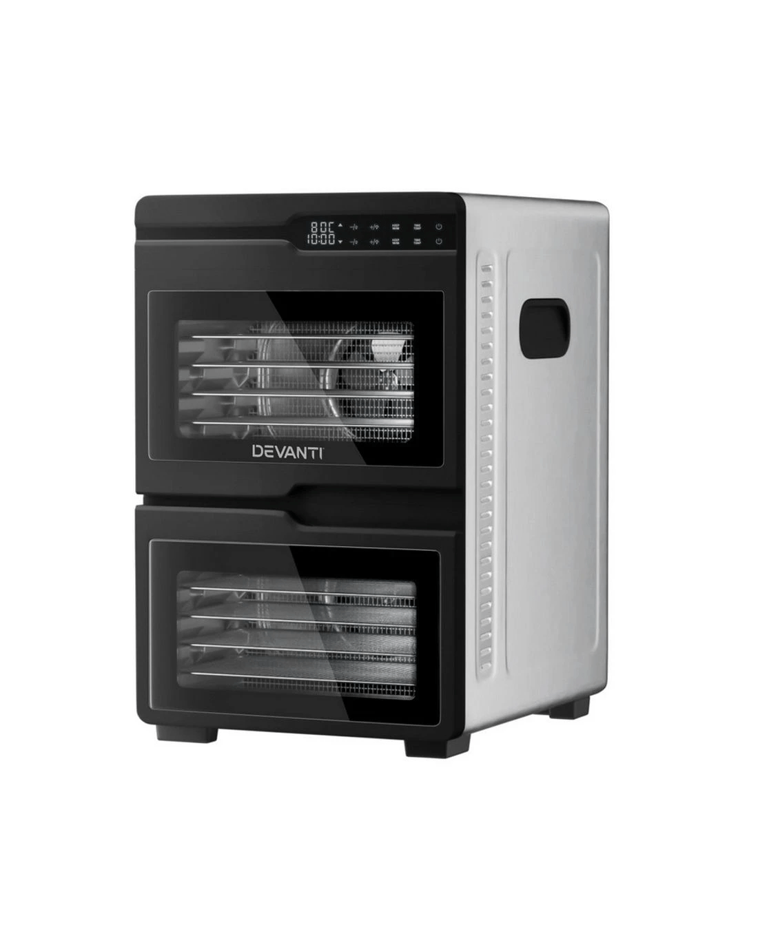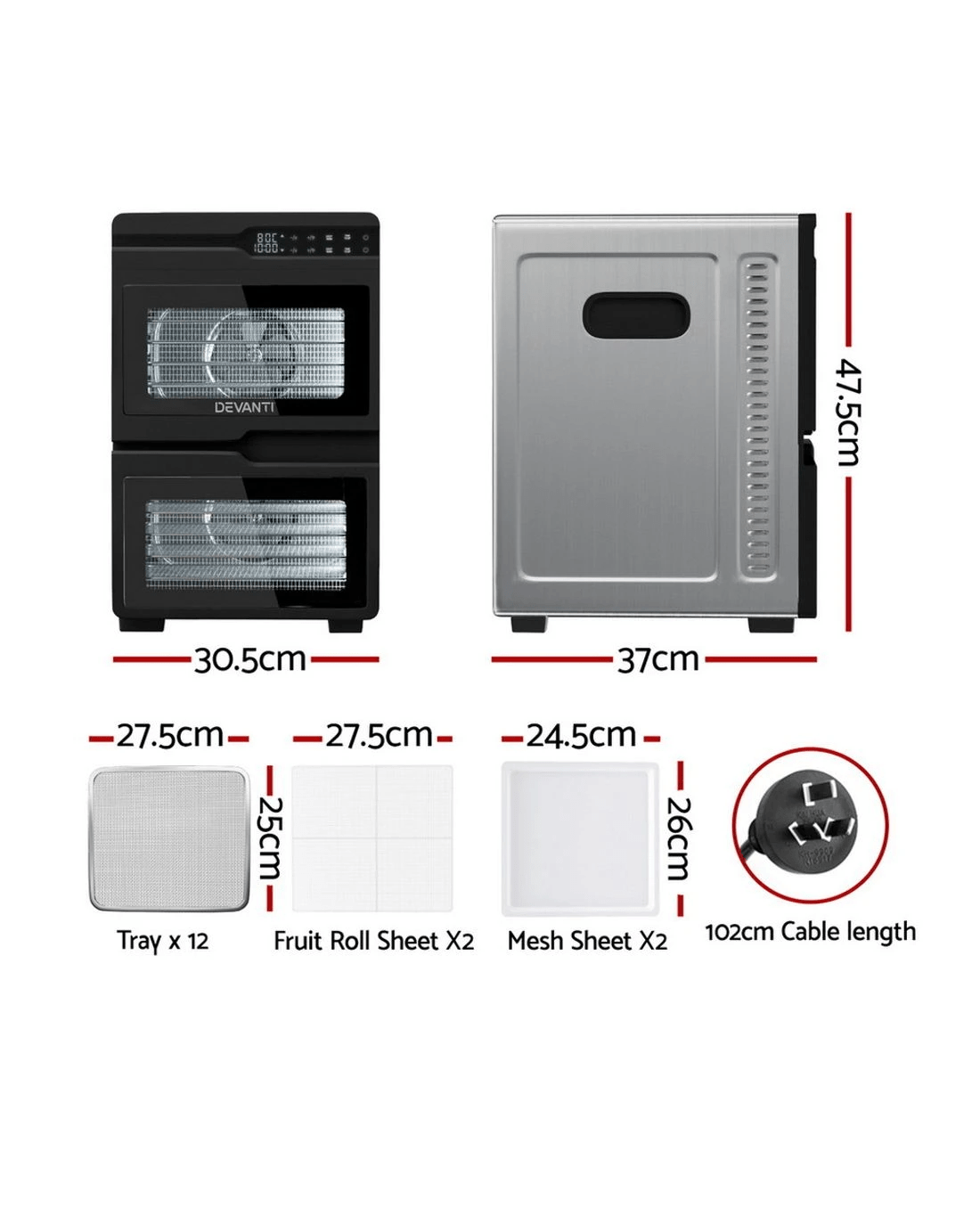 Achieve professional-quality food preservation with Devanti 's premium dehydrator. The dual-zone stainless steel design ensures efficient drying across 12 food-grade trays, while the LED panel lets you precisely control temperatures (35°C–80°C) and timers (up to 48hrs). Monitor progress through the transparent glass door with interior lighting, perfect for fruits, meats, herbs, and jerky. Includes bonus fruit roll sheets and mesh trays for delicate items. Safety features like overheating protection, heat-shielded vents, and anti-slip feet ensure worry-free operation. Commercial-grade construction meets easy cleaning – all trays and accessories are dishwasher-safe.