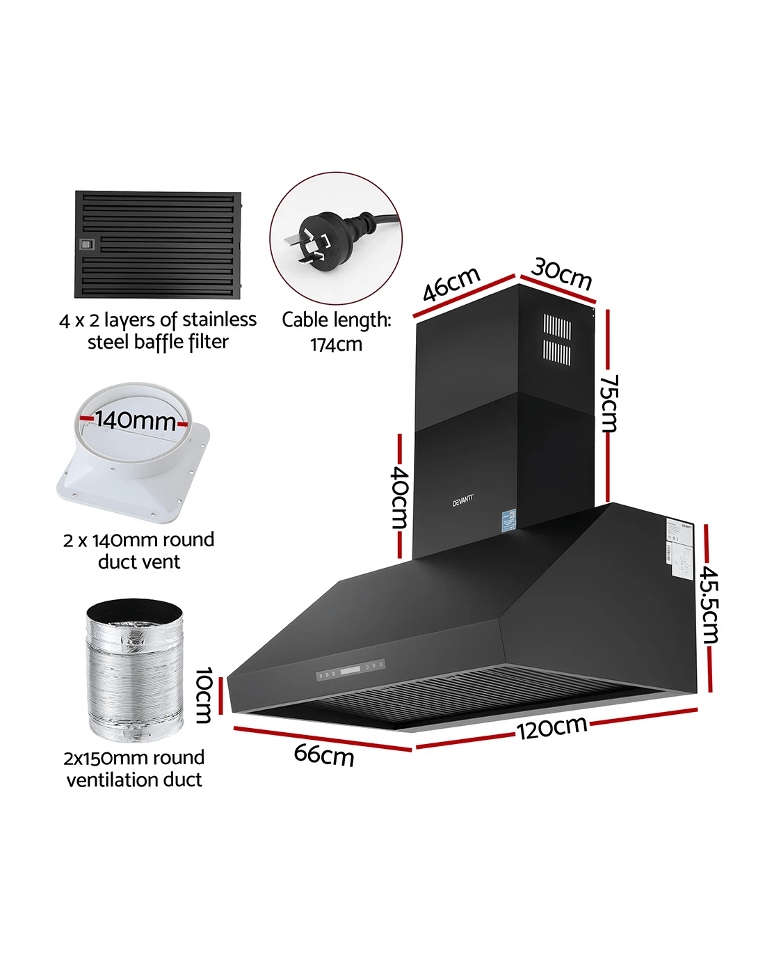 Upgrade your kitchen or outdoor BBQ area with the Devanti 1200mm Range Hood, delivering powerful 2000m³/hr suction to quickly remove smoke, grease, and cooking odors. Built with a durable stainless steel body and a premium textured black finish, this large rangehood is both stylish and long-lasting.