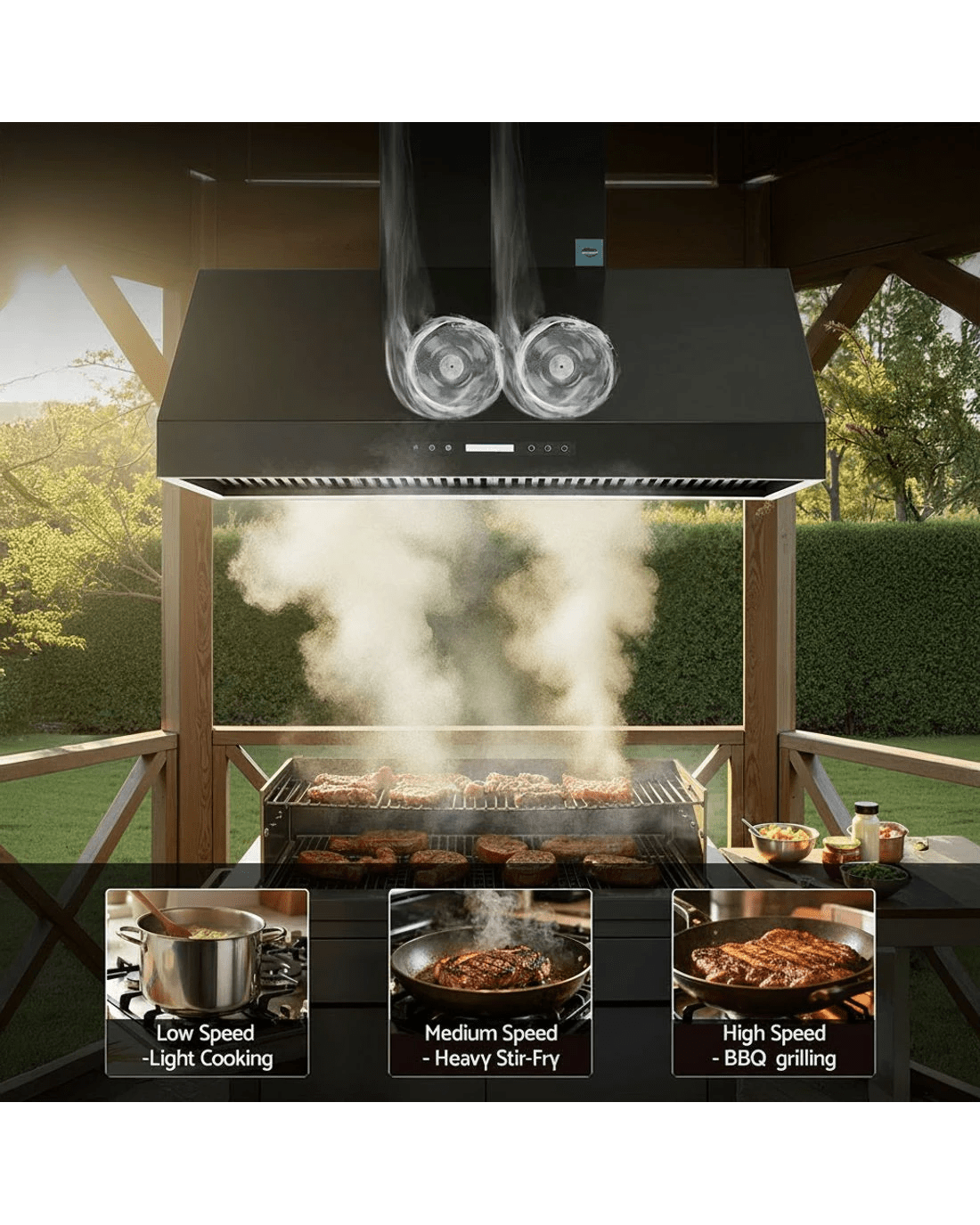 Equipped with dual 218W high-performance motors and 3 adjustable wind speeds, it handles light to heavy smoke with ease—strong enough for BBQ grills and outdoor garden cooking. The touch panel and remote control provide easy, convenient operation from anywhere. 4 energy-efficient LED lights illuminate your grill or stovetop for precise cooking.